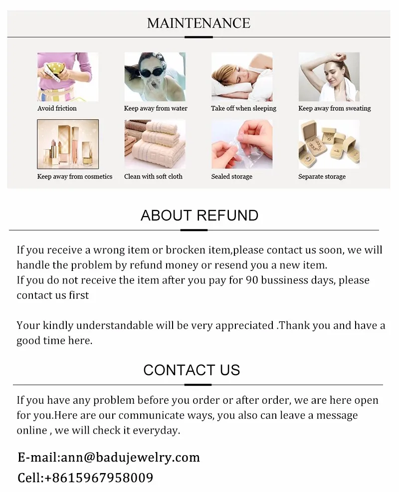 2. После долгой транспортировки некоторые серьги могут сломаться. Если сломан, пожалуйста, свяжитесь со мной, мы предложим вам удовлетворительный ответ.