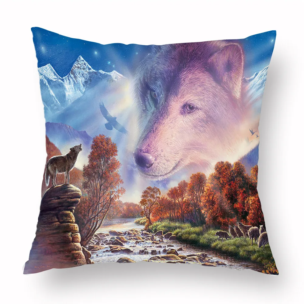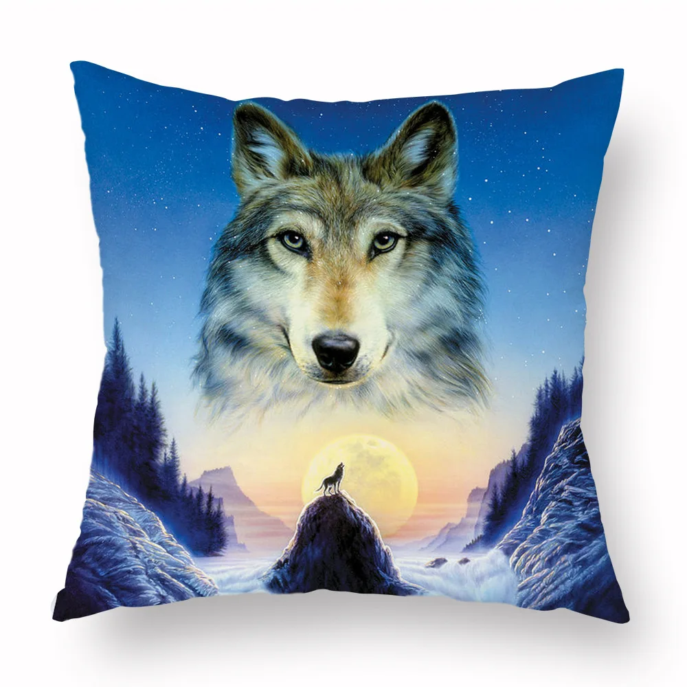 Односторонние синие дешевые чехлы с животными для подушек, винтажные декоративные подушки из полиэстера с волком, чехол для дивана, стула, домашний декор, модный