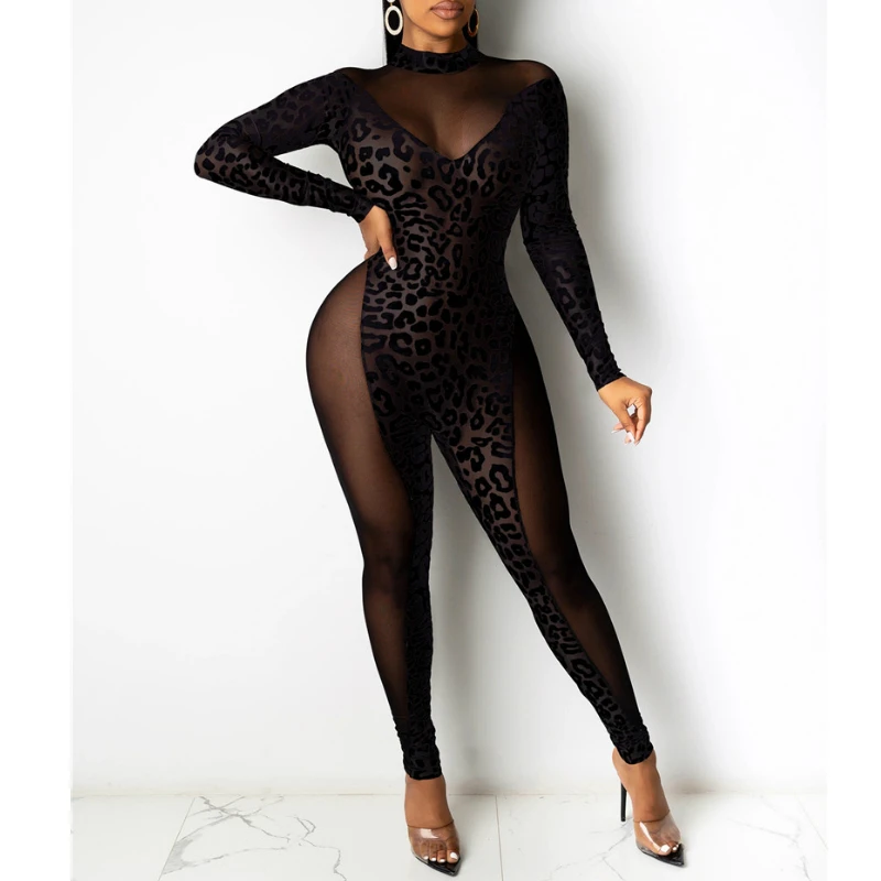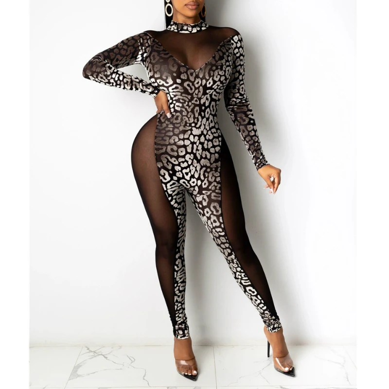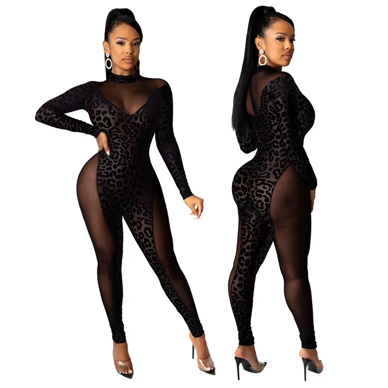 Женские пикантные уличные Клубные комбинезоны сетки Перспектива V образным вырезом бархат Леопардовый принт пэтчворк комбинезоны с длинным рукавом, тонкий одежда