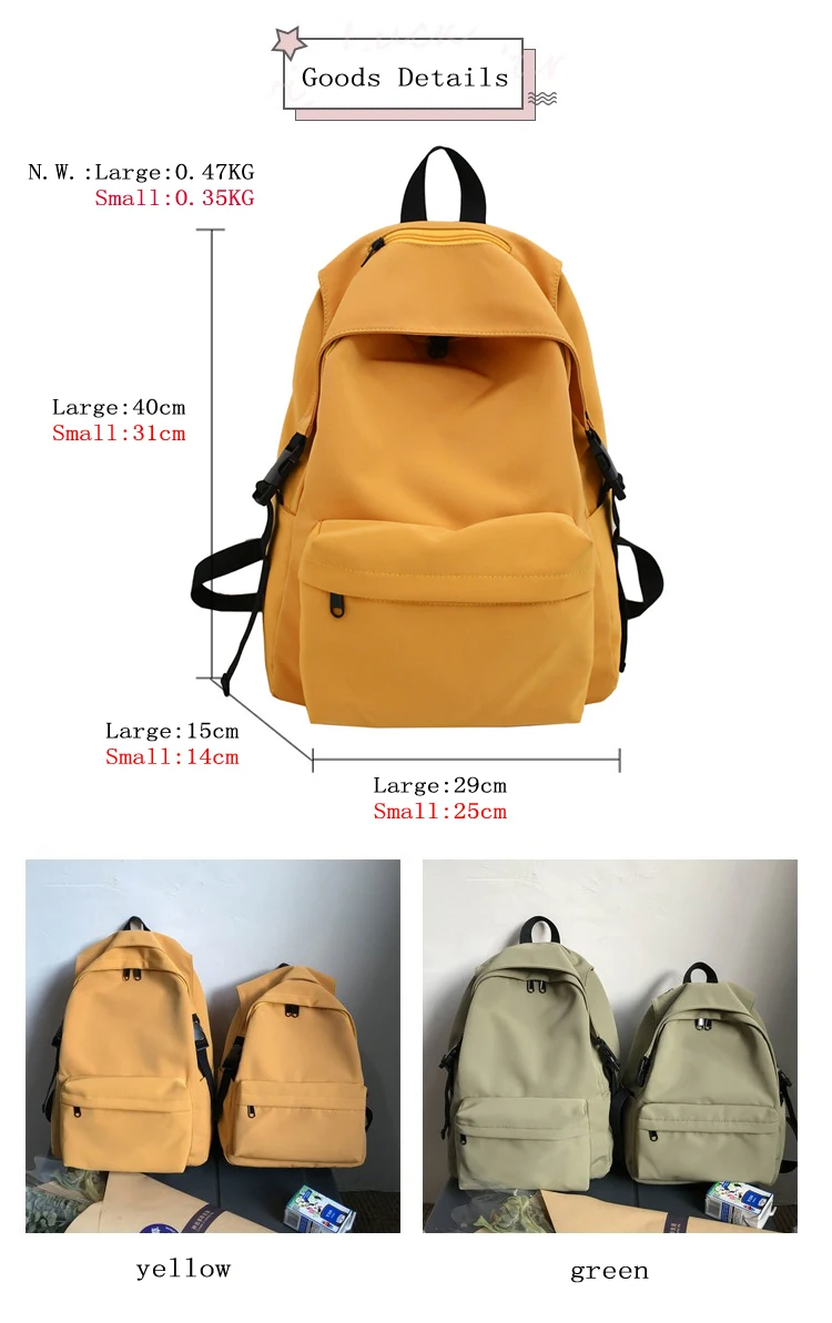 100% Новый бренд2021 модные водонепроницаемые нейлоновые рюкзаки, женская сумка через плечо, женский большой маленький дорожный рюкзак для девочек-подростков, школьная сумка MochilasБольшой размер: длина 29 см * высота 40 см * толщина 15 смМаленький размер: длина 25 см * Высота 31 см * толщина 14 смСтиль: модный рюкзак для отдыхаЦвет: синий, черный, зеленый, желтый, серыйИспользование: рюкзак, Студенческая сумкаВес: 0,35 кг-0,47 кг (приблизительно)Примечание 1: 1 дюйм = 2,54 см, 1 см = 0,39 дюймовПримечание 2: цвет может немного отличаться из-за настроек монитора компьютера.Примечание 3: при разнице в способе измерения допускается отклонение в размере на 1-3 см.