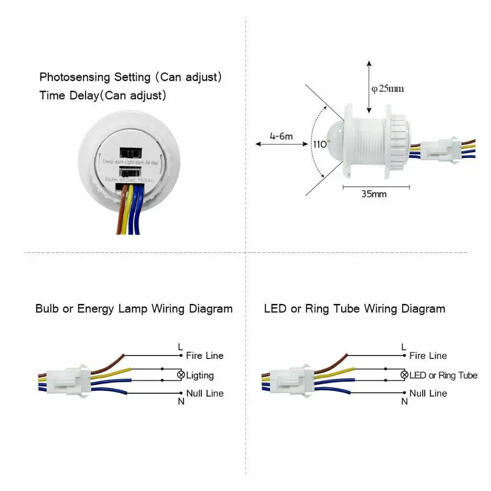 Тип: инфракрасный датчик движения из PIR детектор Цвет: белый Материал: ПВХ рекомендуется установить Диаметр отверстия: около 20 мм Диапазон срабатывания: около 4-6 м Время задержки: около 45 с Угол освещения: 110 ° Рабочее напряжение: 110-265 в управление светильник: >= 3 люкс Настройка режима: глубокий темный светильник темный/весь день мощность: ≤ 40 Вт Потребляемая мощность в режиме ожидания: рабочая температура менее 0,1 Вт: -20-45 ℃