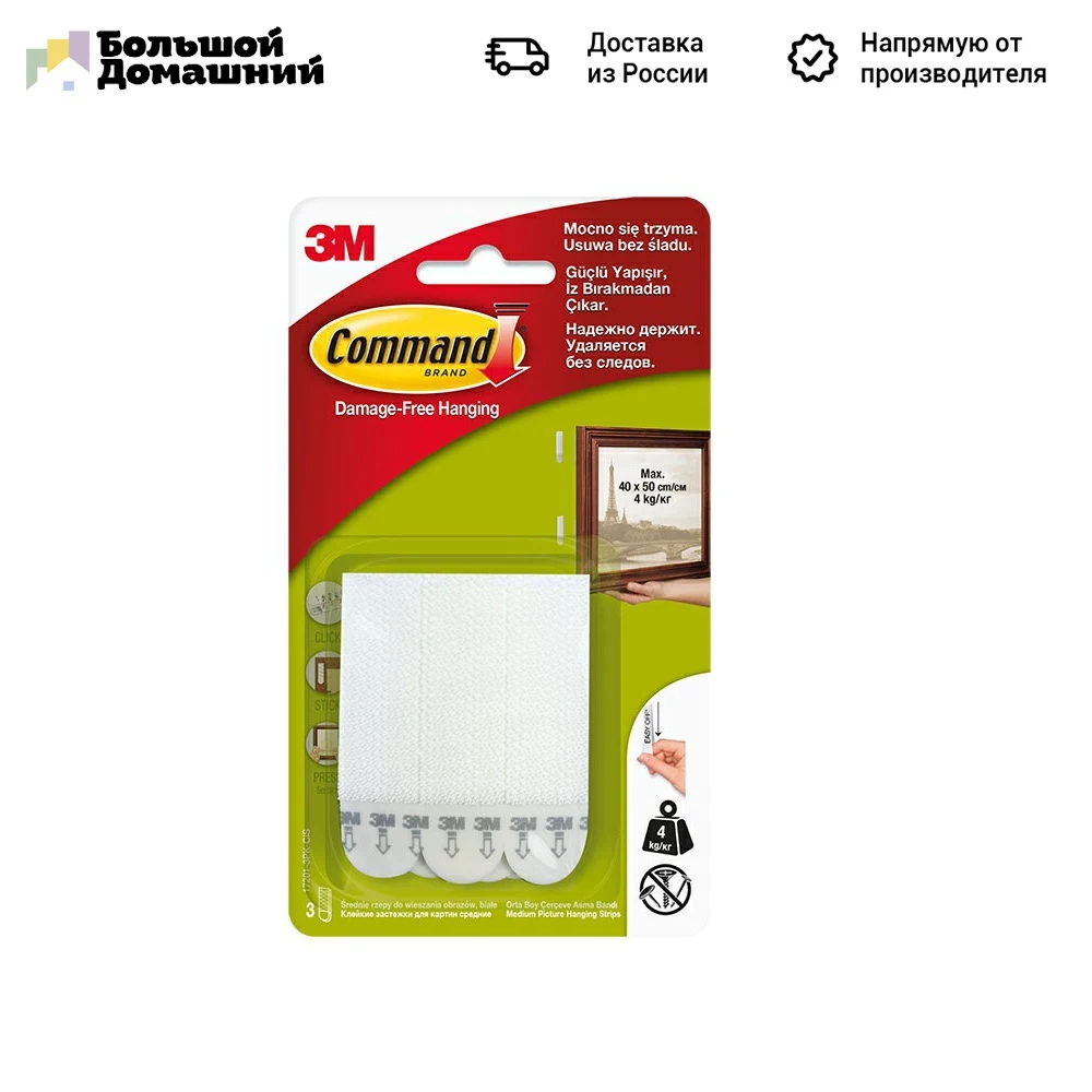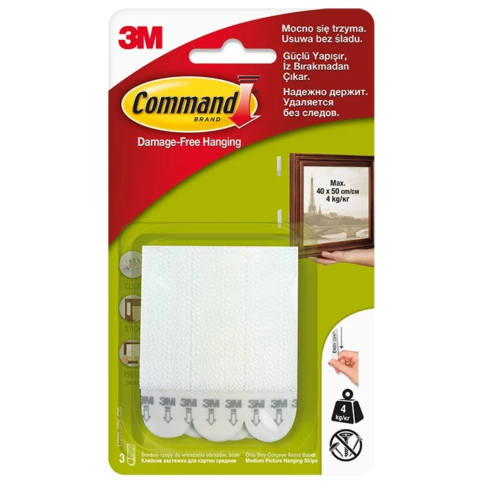 Благодаря настенным застежкам Command® любое помещение легко декорируется картинами и плакатами. Все изображения, зафиксированные настенными застежками, легко заменяются, т.к. при снятии картины нет необходимости удалять с поверхности сам крепеж. Одна застежка фиксируется на стене, а другая - на раме. Именно поэтому Вы можете вешать и снимать Ваши фотографии и другие малые декоративные предметы так часто, как пожелаете.- 3 пары белых средних застежек- Максимальная нагрузка: 4 кг на упаковку- Для рамок и картин, настенных часов, домофонов, роутеров.