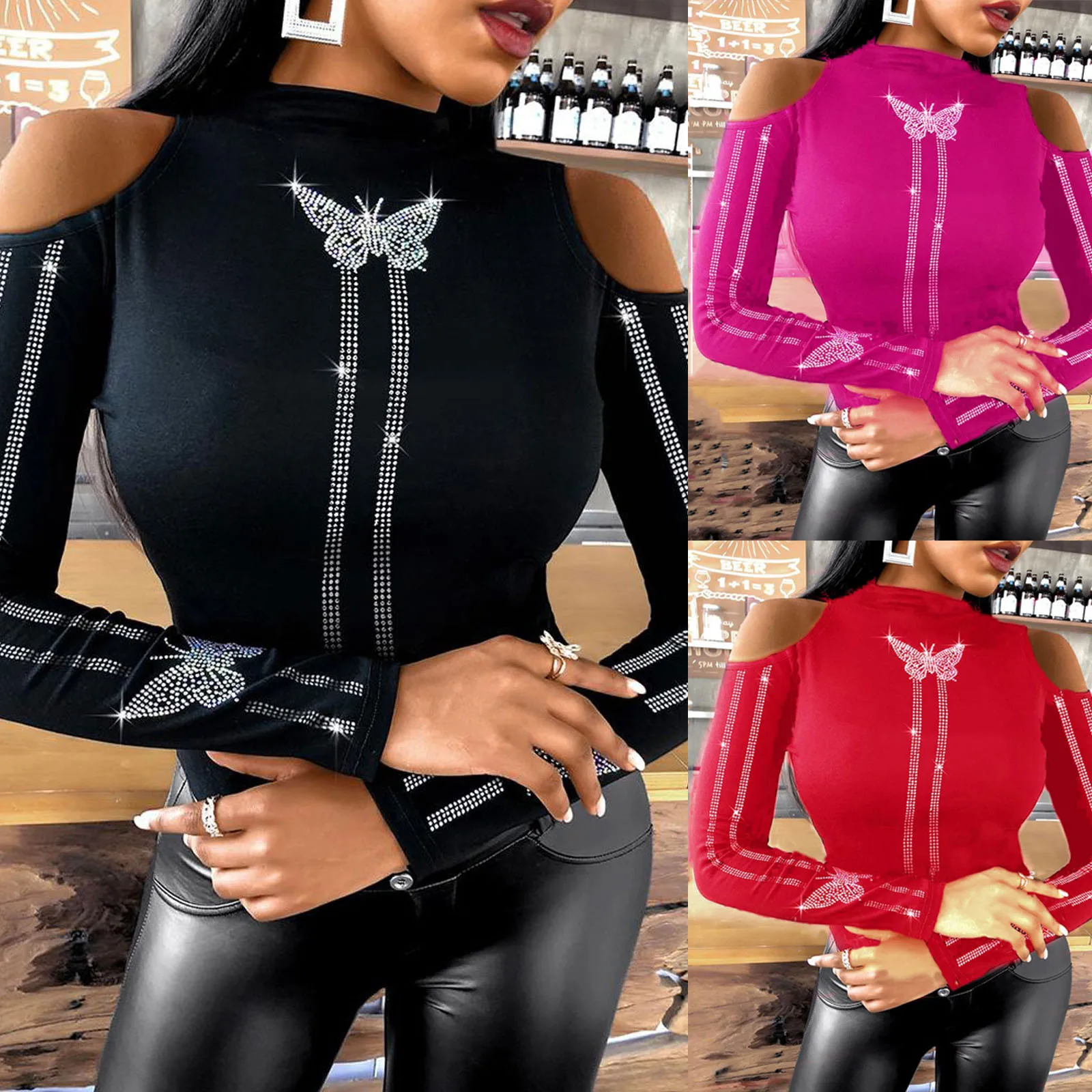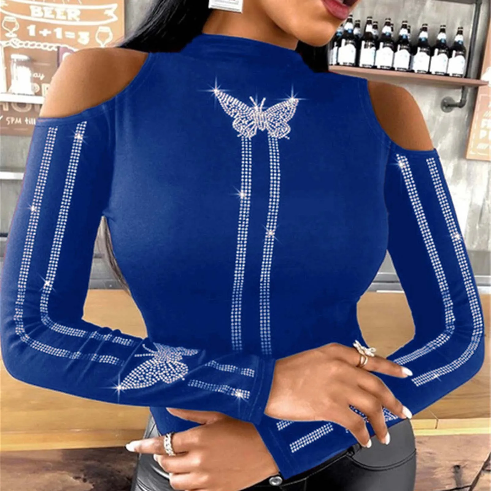 Женские сексуальные рубашки 40 #, модный топ с открытыми плечами и узором бабочки Стразы, топы с шипами, уличная одежда, Осенние блузки, топ