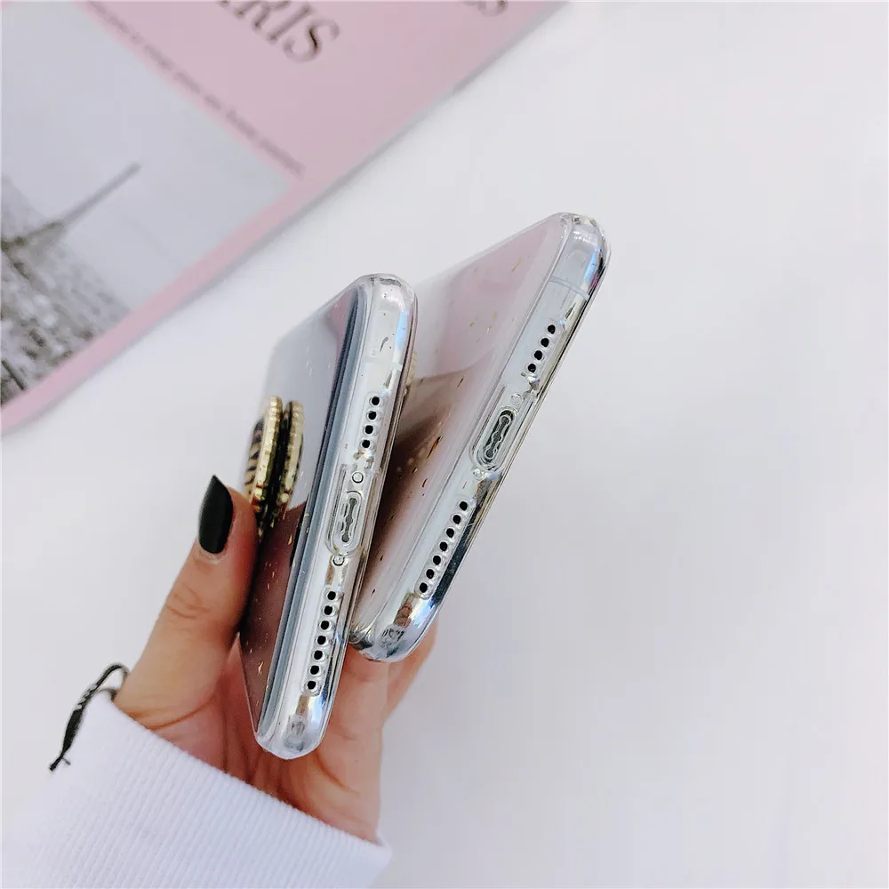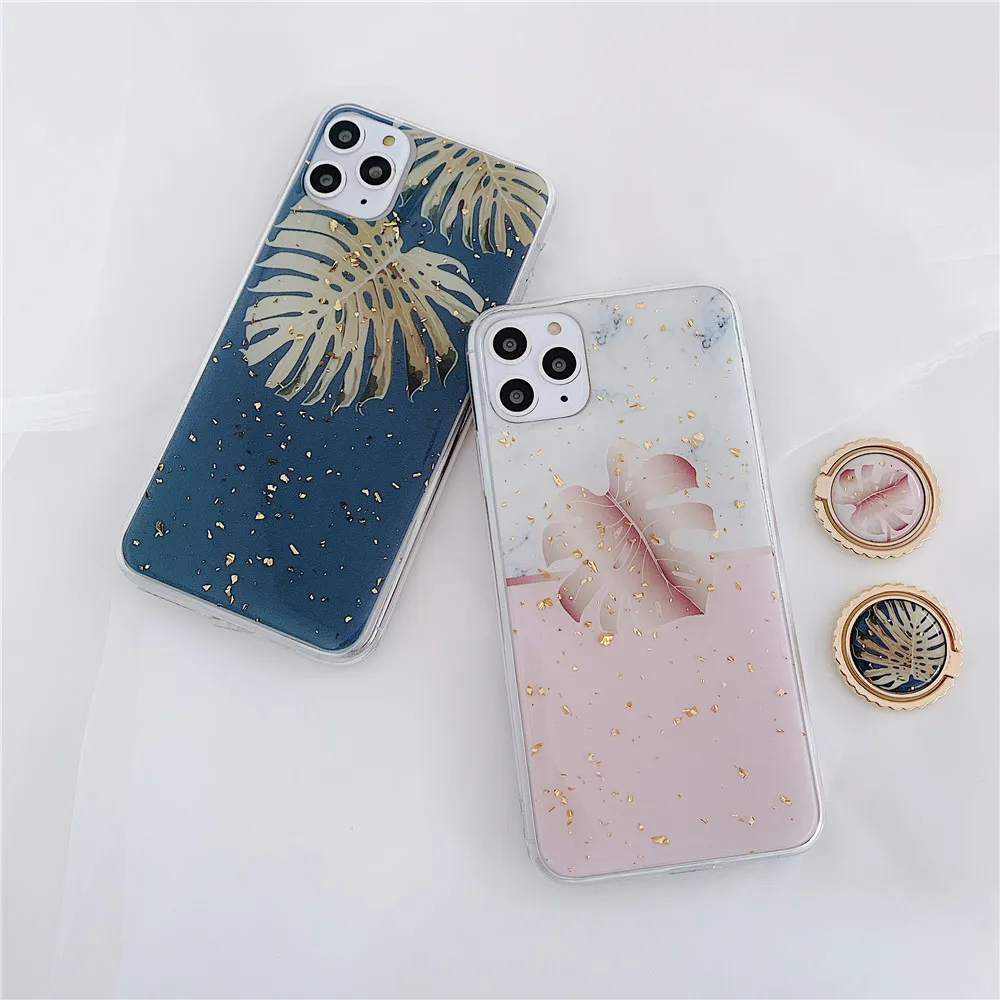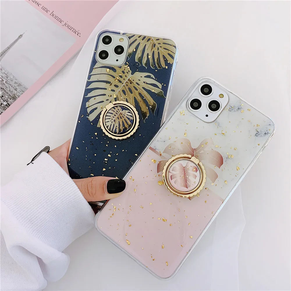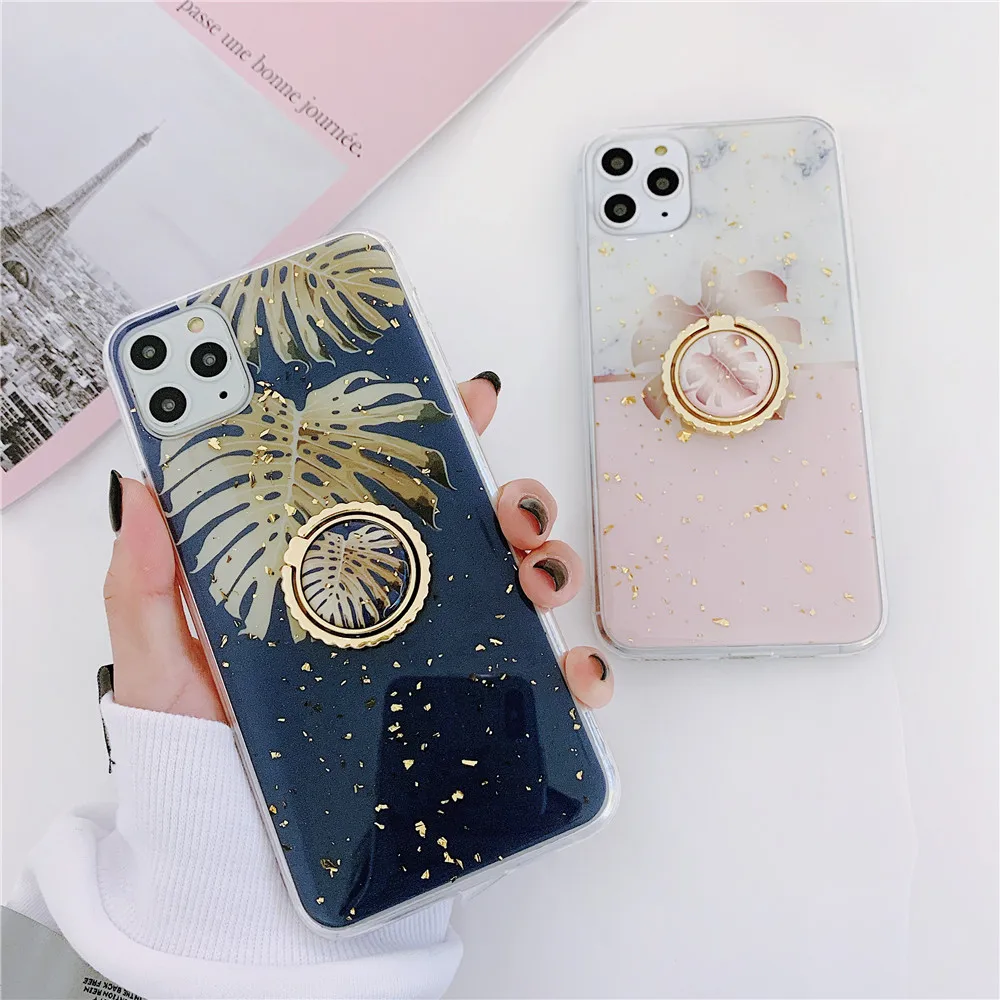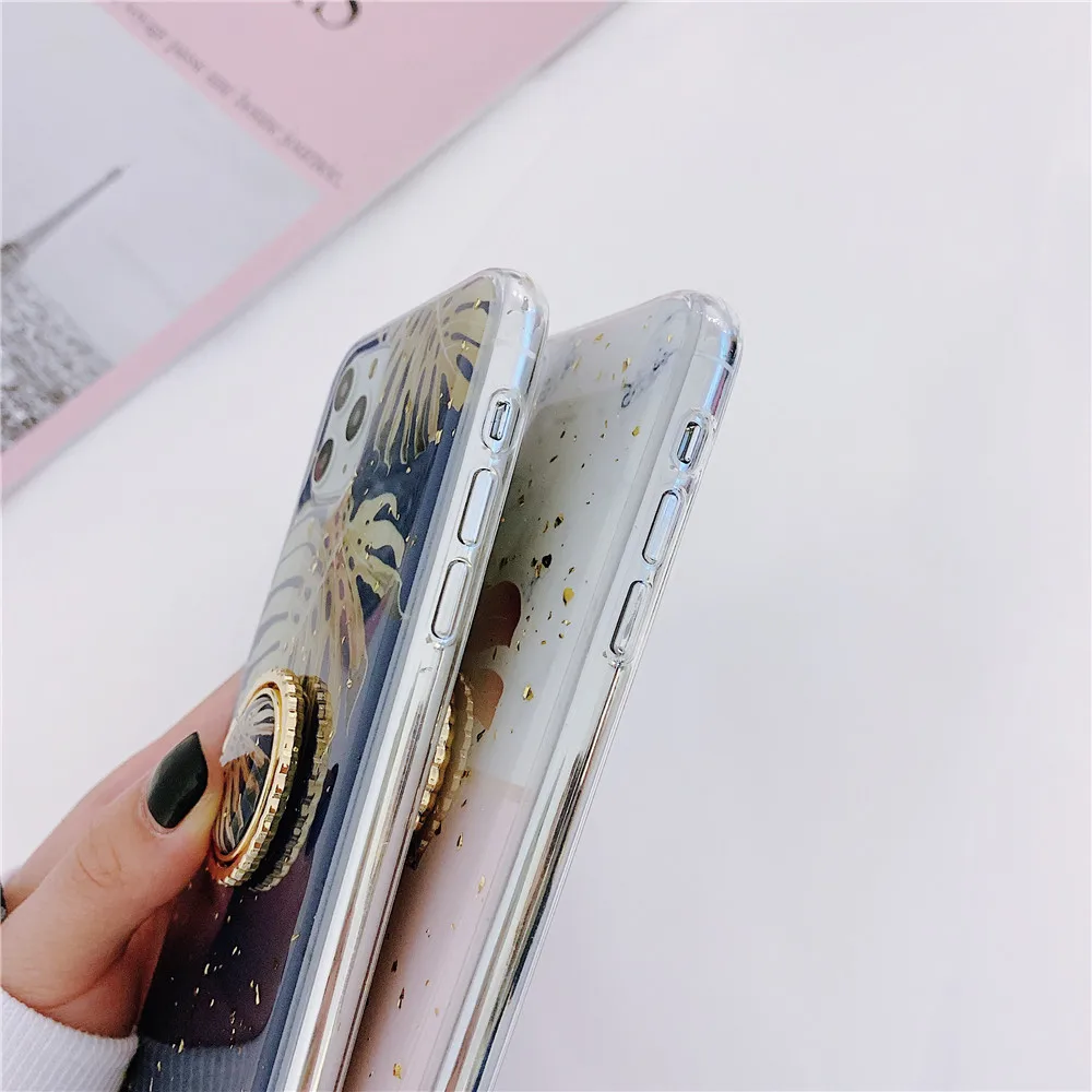 Чехол для телефона с кольцом-подставкой для iphone 12, 11 Pro, Max, Xs, max, XR, 8, 7plus, мягкий силиконовый чехол из ТПУ с золотой фольгой, чехол с рисунком банановых листьев