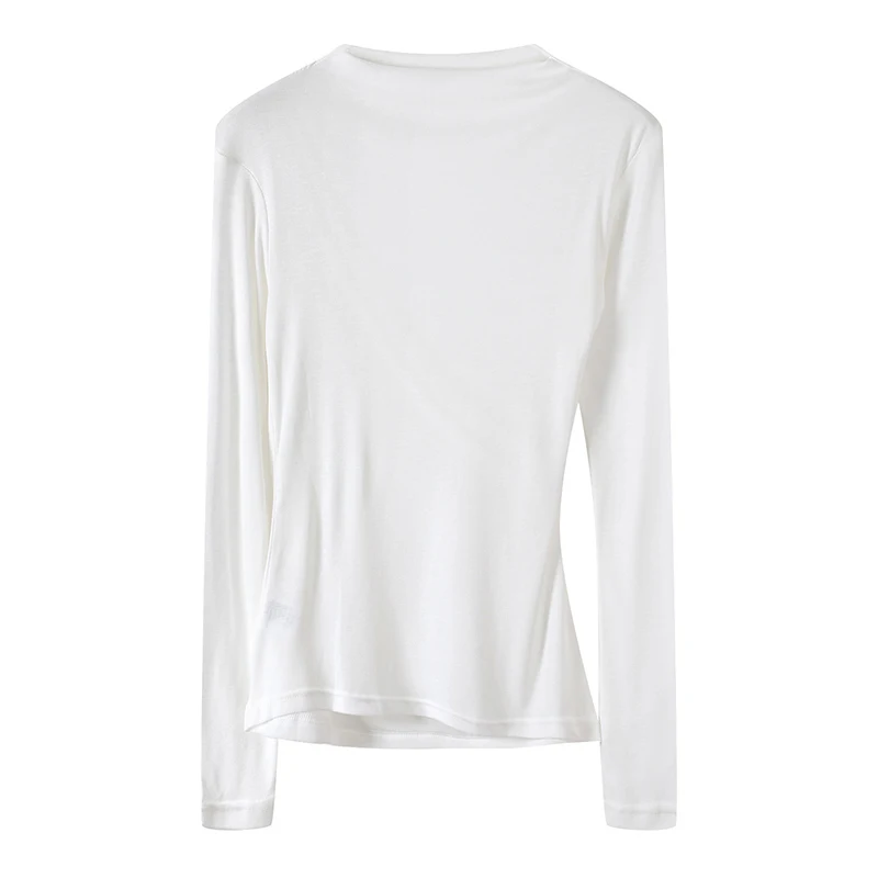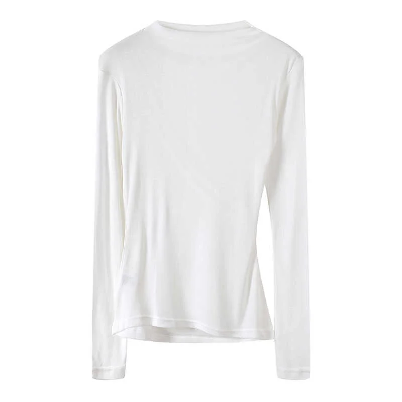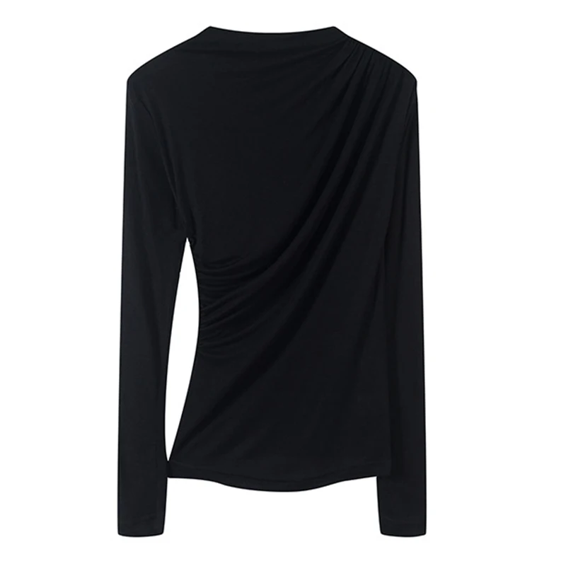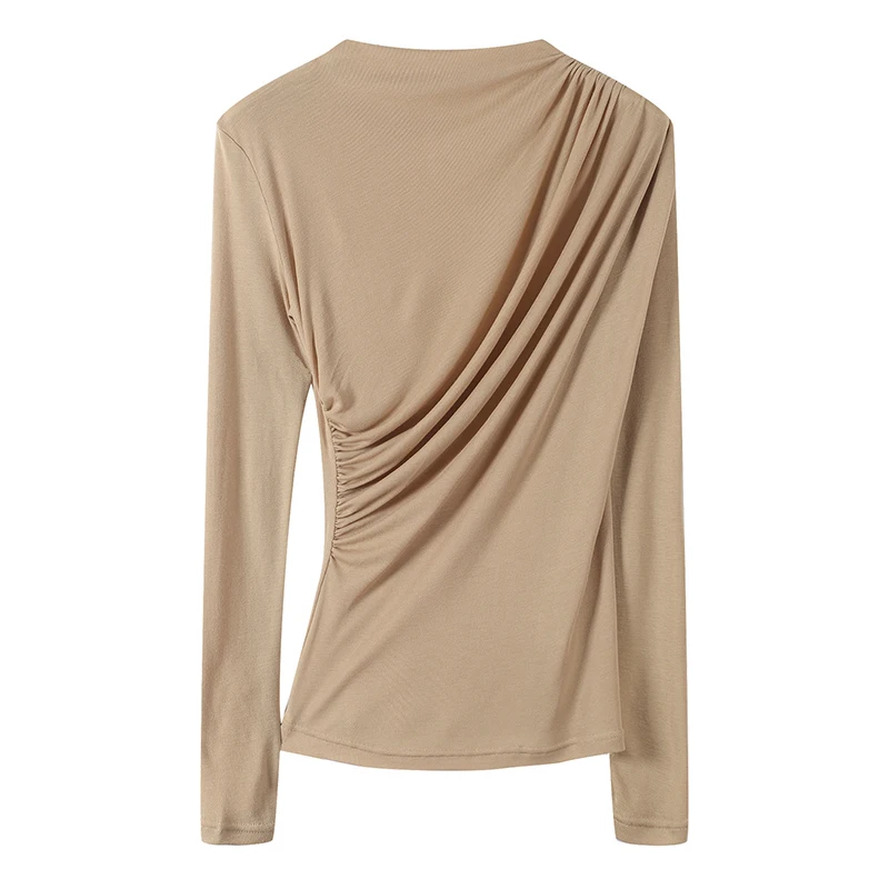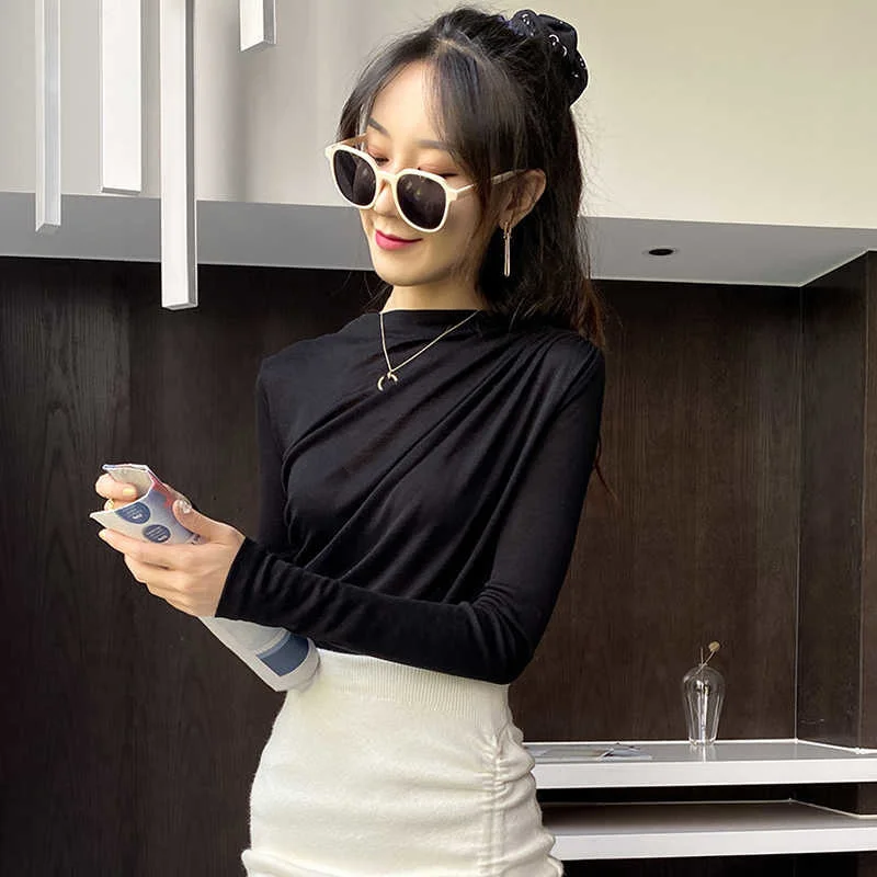 CHICEVER однотонная короткая футболка для женщин с круглым вырезом и длинным рукавом, с рюшами, вязаные тонкие повседневные футболки для женщин, 2022 весенняя одежда, Новинка