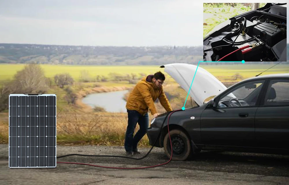 Гибкая солнечная панель, 1 шт., 100 Вт, 12 В Солнечный контроллер, 1 шт., 10 А, 12 В/24 В 1 комплект кабеля с зажимами для батарей 1 комплект кабеля с солнечным PV разъемом 1 шт. многоязычное Руководство