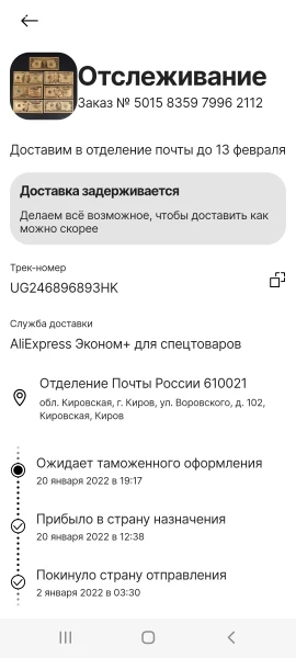 Страна: RU Доставка: Cainiao Super Economy for Special Goods 18.02.2022