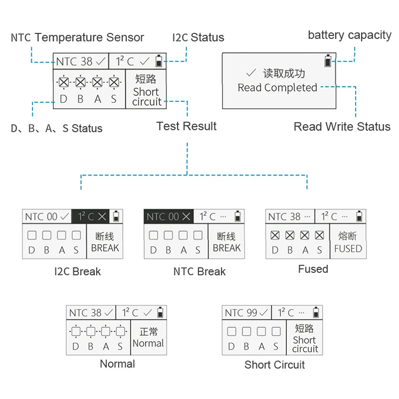 1,3 в 1 программист, Быстрая проверка идентификации лица ("нормальный" "предохранитель отключен" "NTC отключен" короткий ") 2. Поддержка обновленной модели в ближайшем будущем 3. Быстрая проверка рабочего состояния ID лица 4. Встроенный внутренний аккумулятор, прост в работе 5. Он может писать и читать чип с паролем