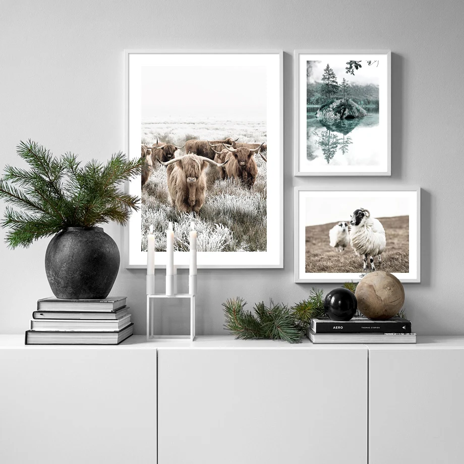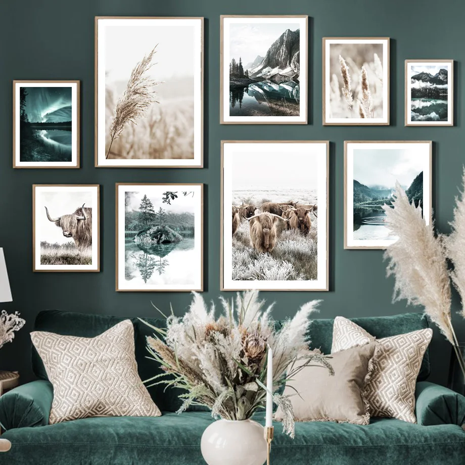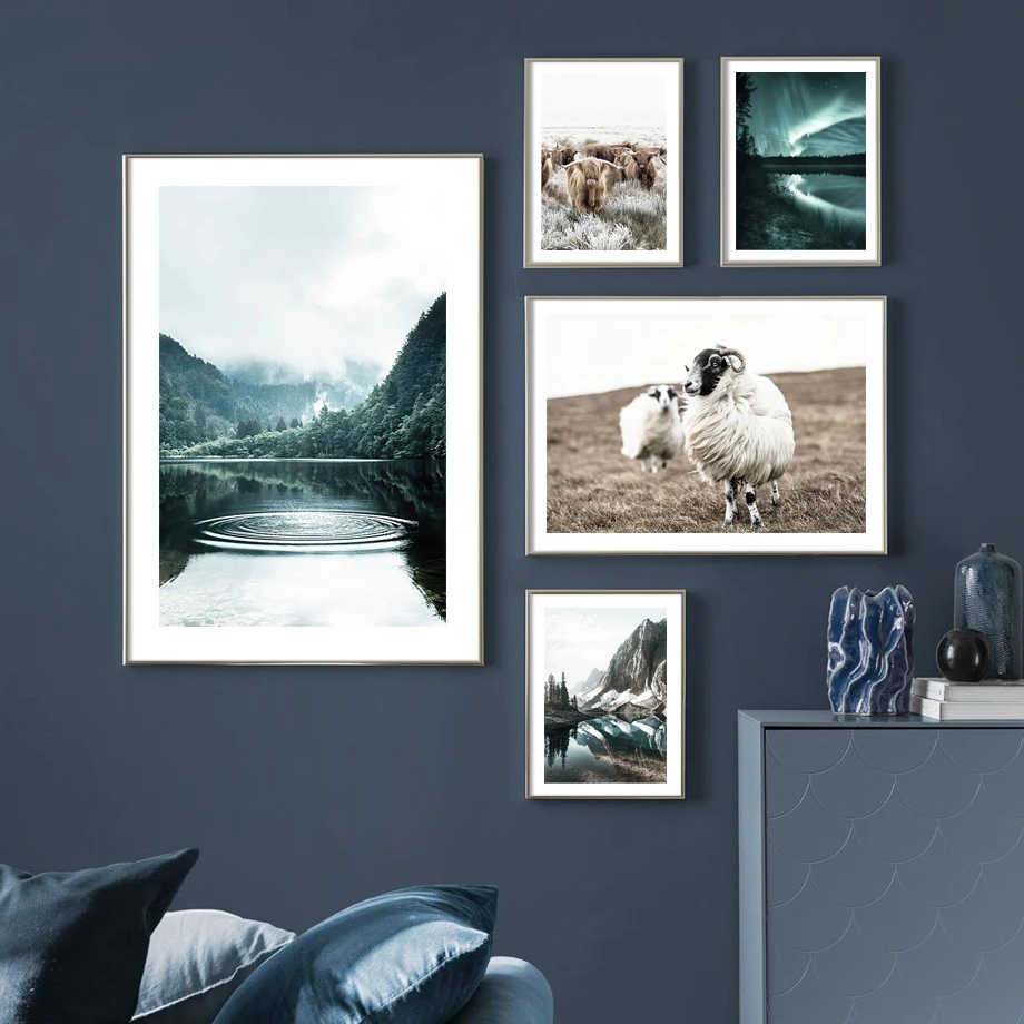 Бежевые камышы Луг корова овца горы скалистое озеро настенные художественные принты Холст Картина скандинавский плакат Декор картинки для гостиной