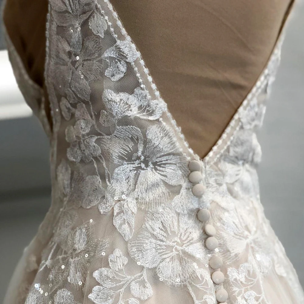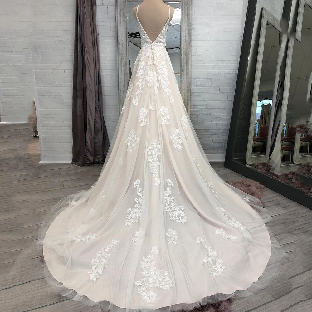UZN элегантный светильник цвета шампанского ТРАПЕЦИЕВИДНОЕ свадебное платье с кружевной аппликацией v-образный вырез без рукавов Бисероплетение свадебное платье цвета слоновой кости на бретельках с открытой спиной Свадебные платья