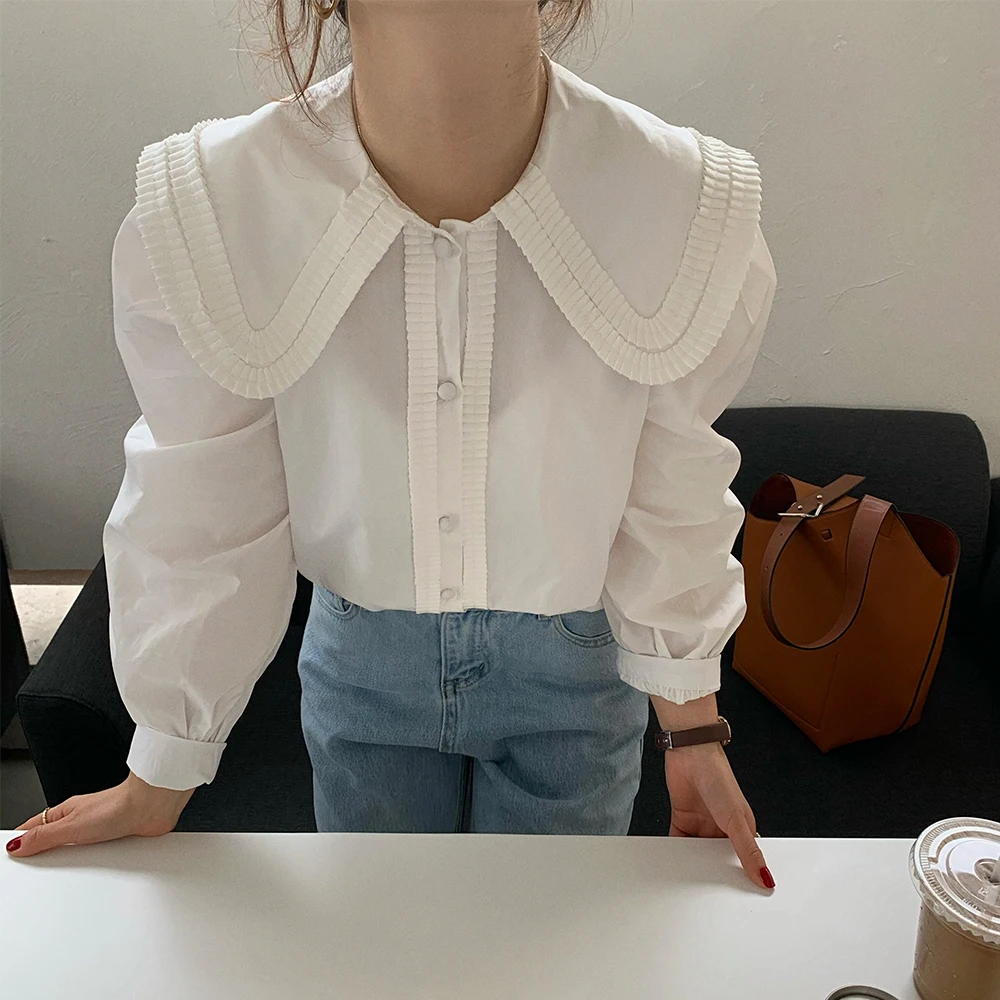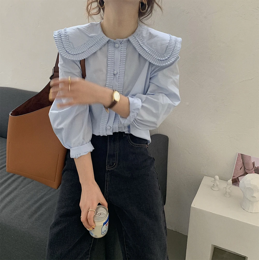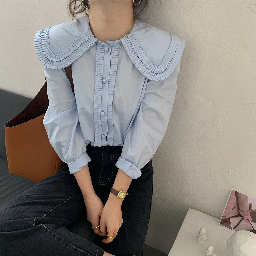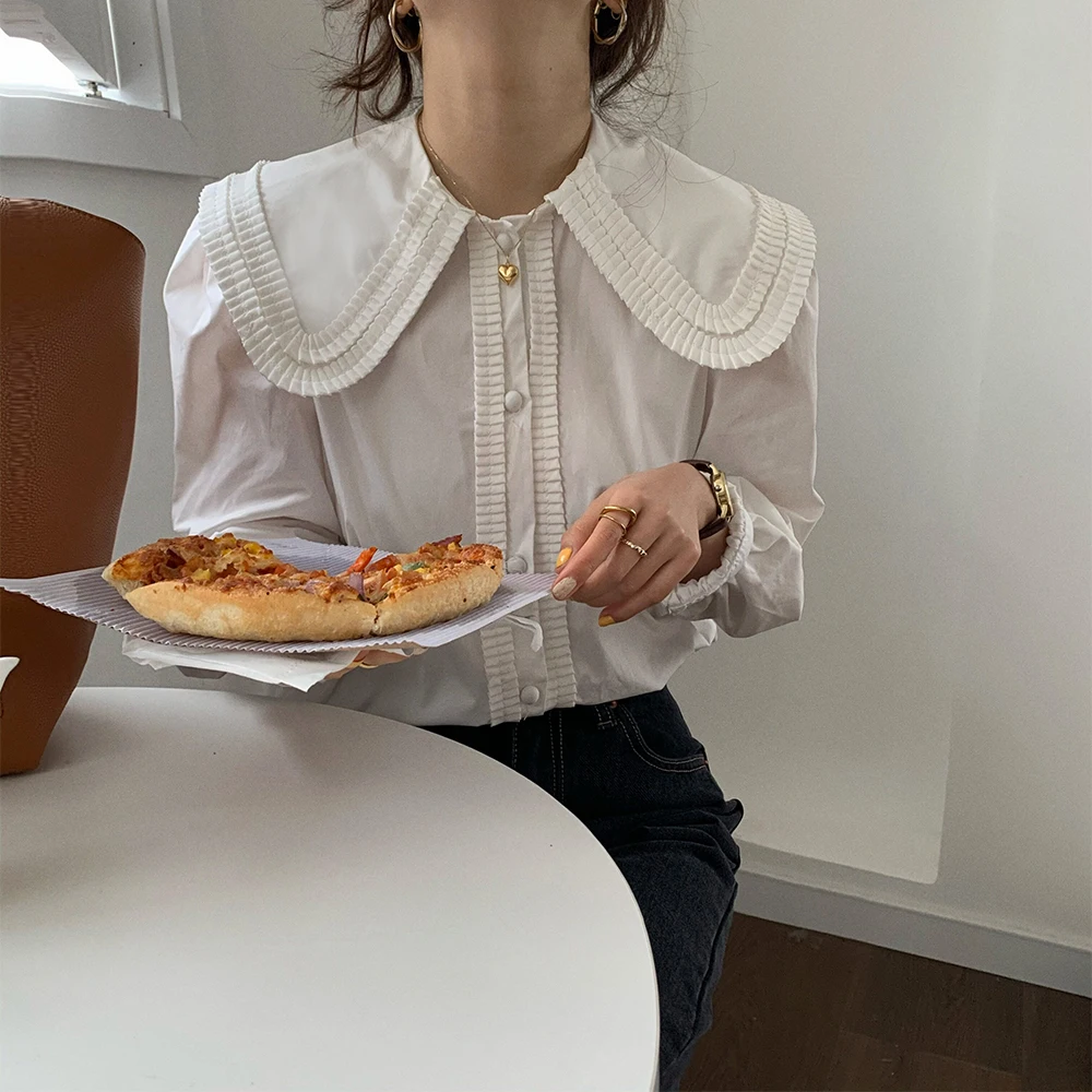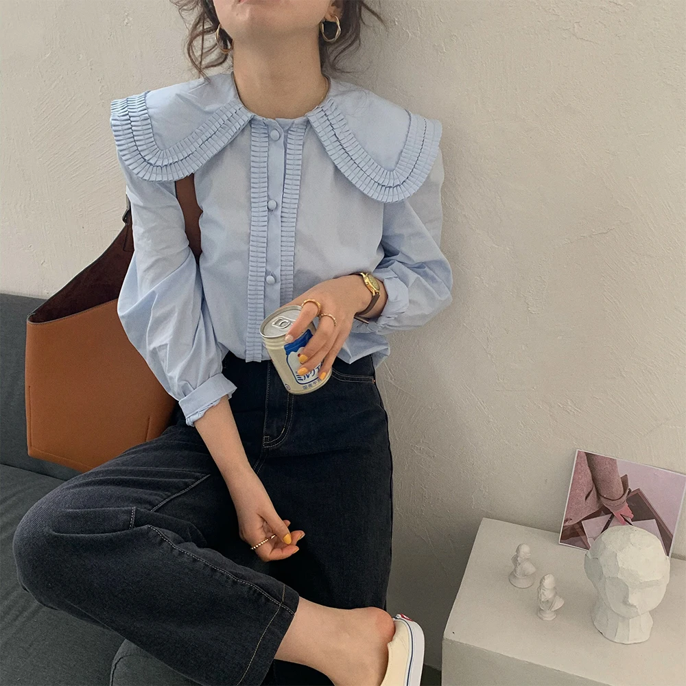 Рубашка Alien Kitty Женская шикарная в стиле ретро, нежная плиссированная Элегантная блузка с воротником Питер Пэн и длинными рукавами, Короткие топы, весна 2021