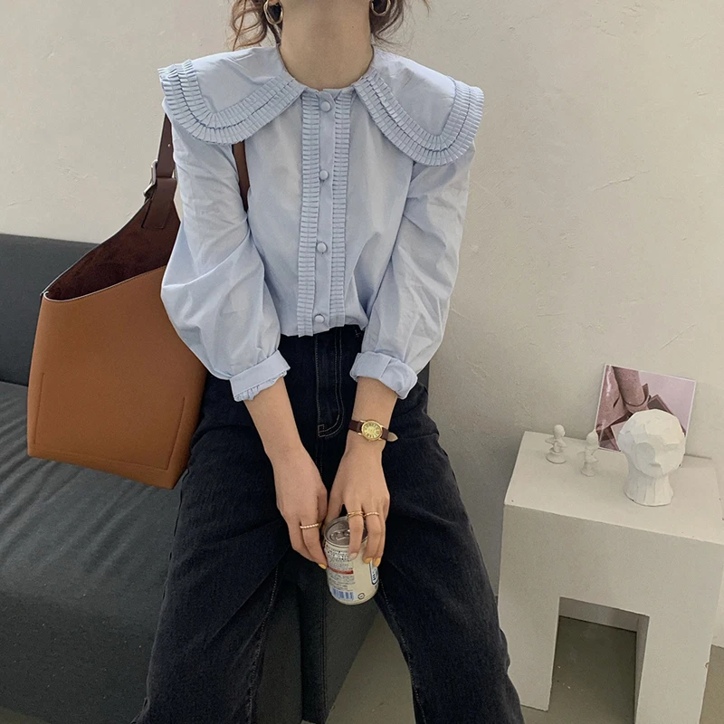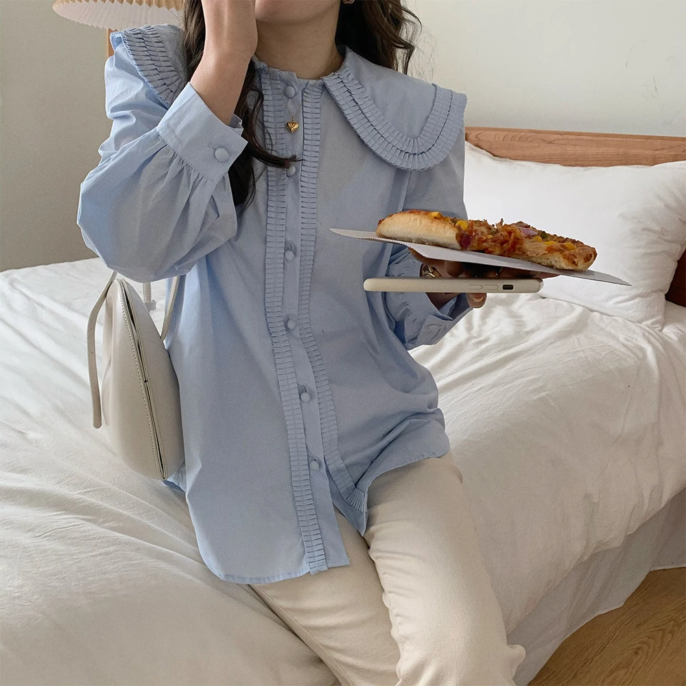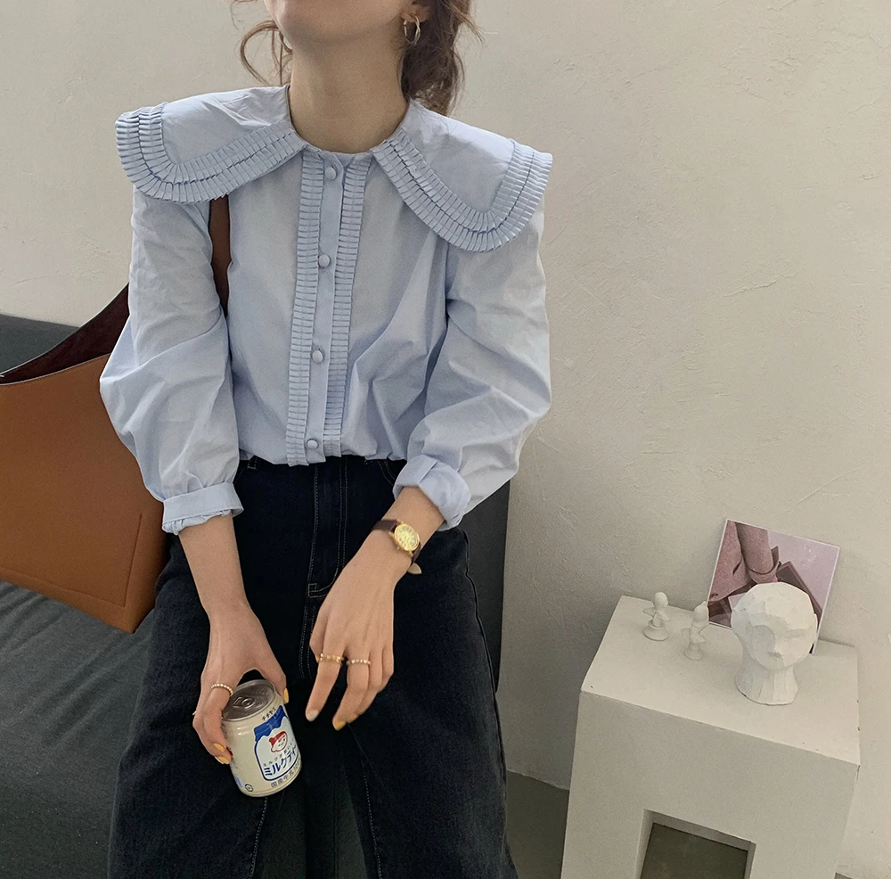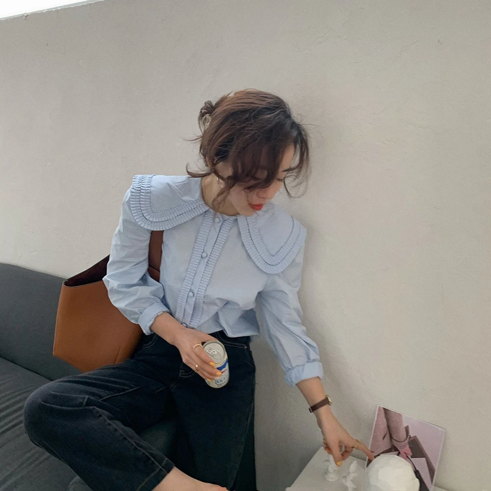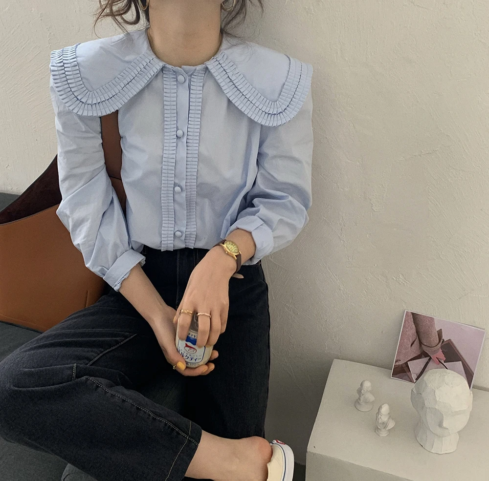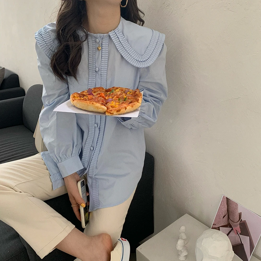 Рубашка Alien Kitty Женская шикарная в стиле ретро, нежная плиссированная Элегантная блузка с воротником Питер Пэн и длинными рукавами, Короткие топы, весна 2021