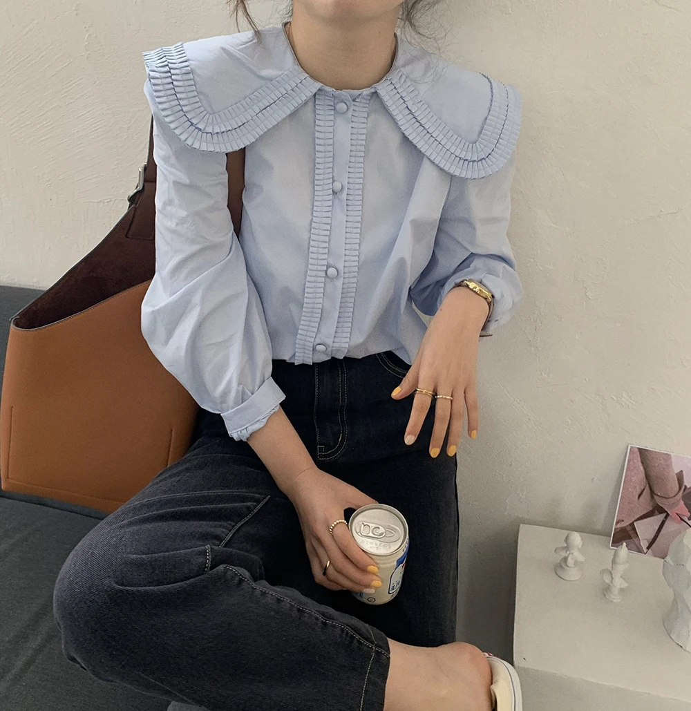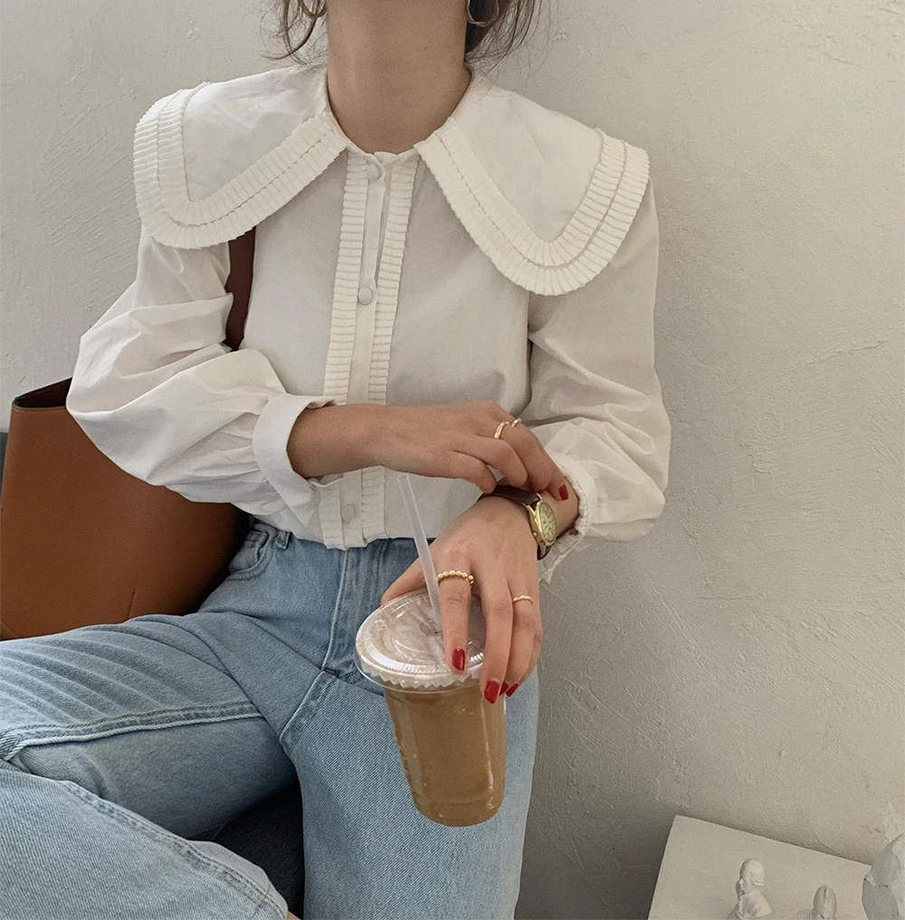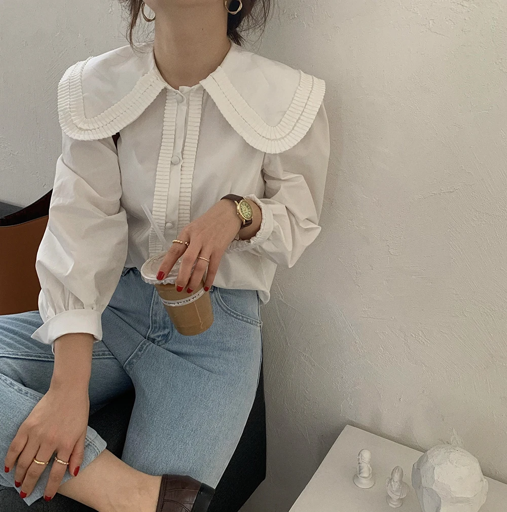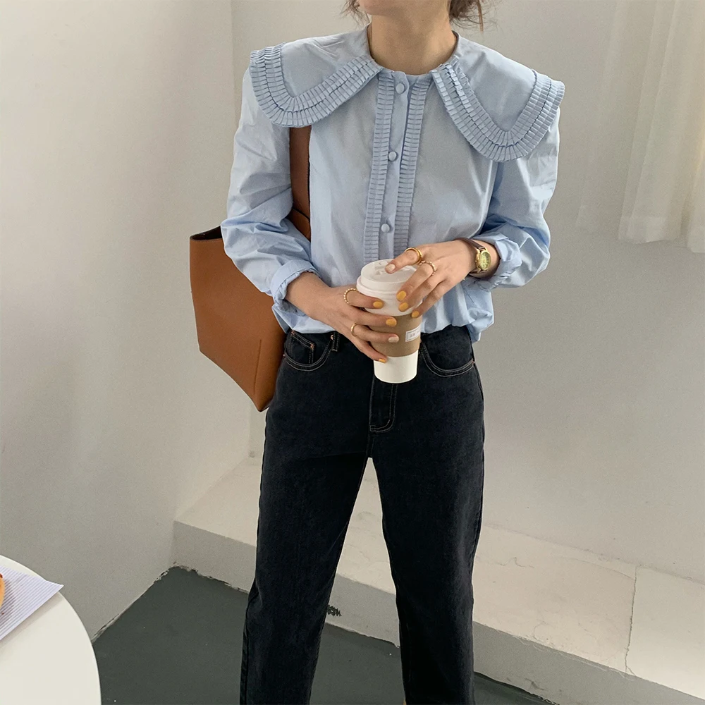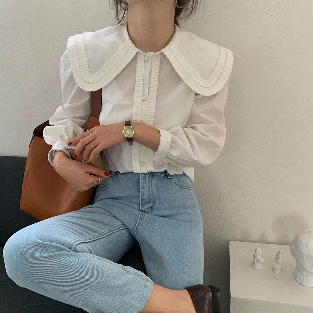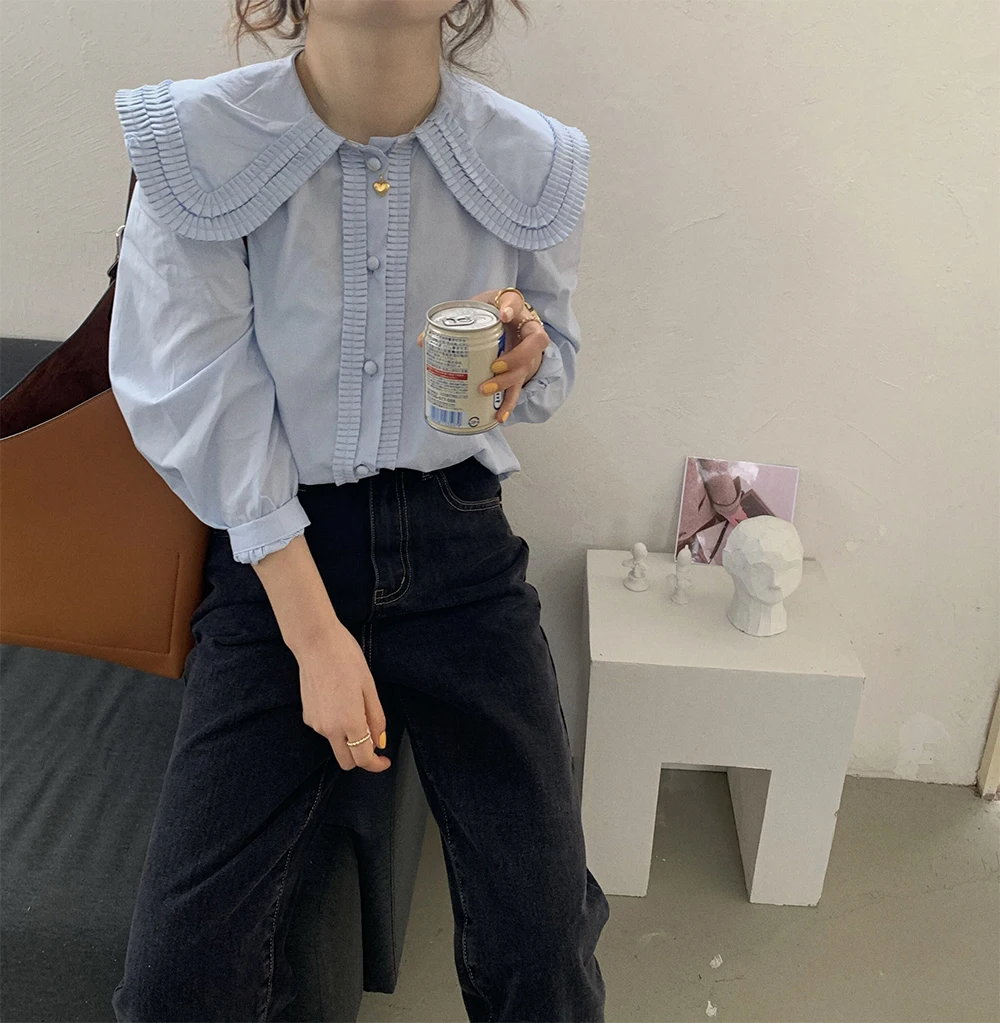 Рубашка Alien Kitty Женская шикарная в стиле ретро, нежная плиссированная Элегантная блузка с воротником Питер Пэн и длинными рукавами, Короткие топы, весна 2021