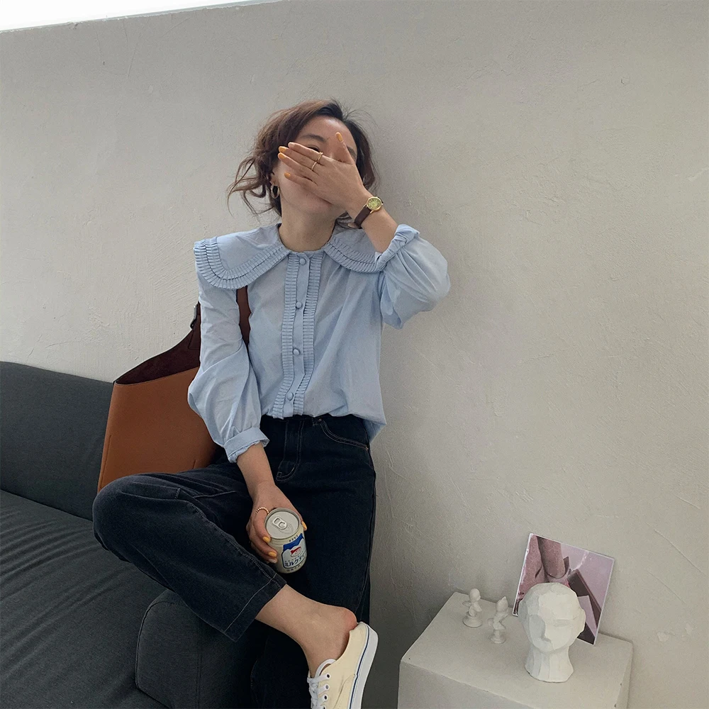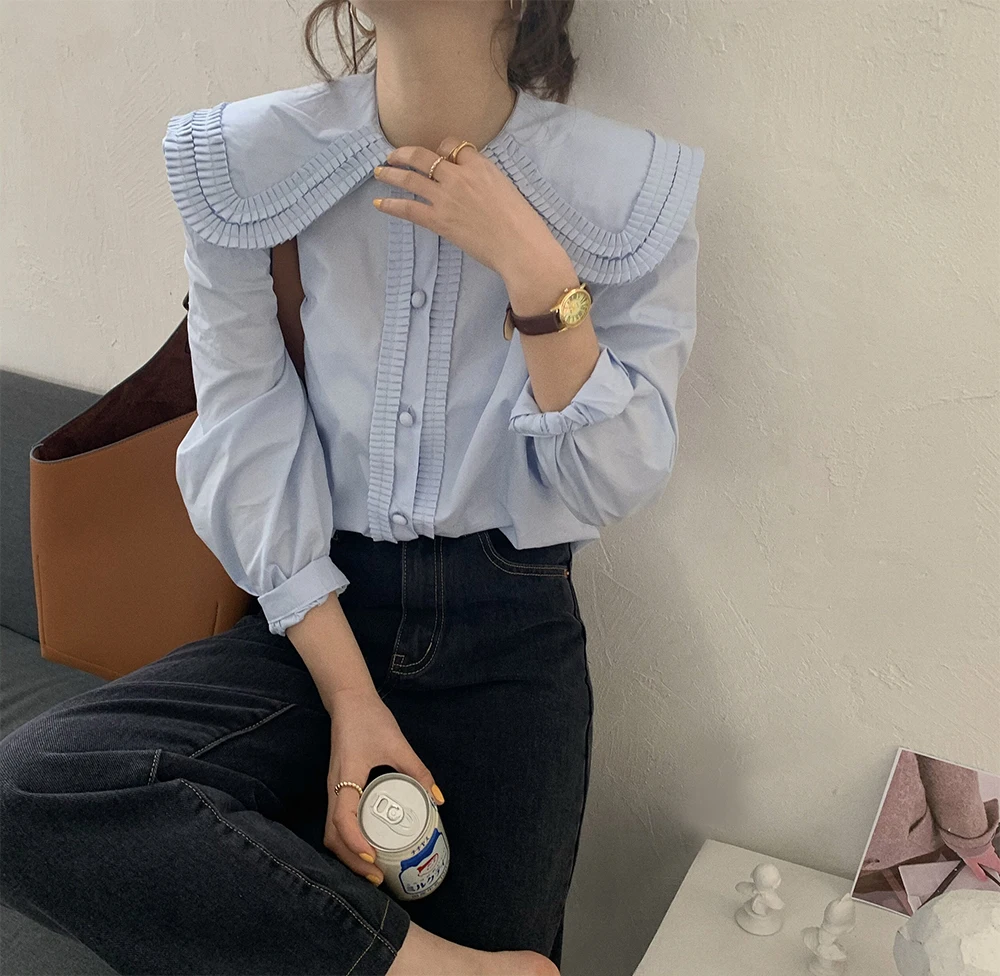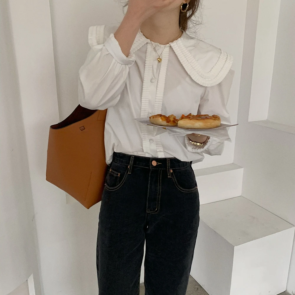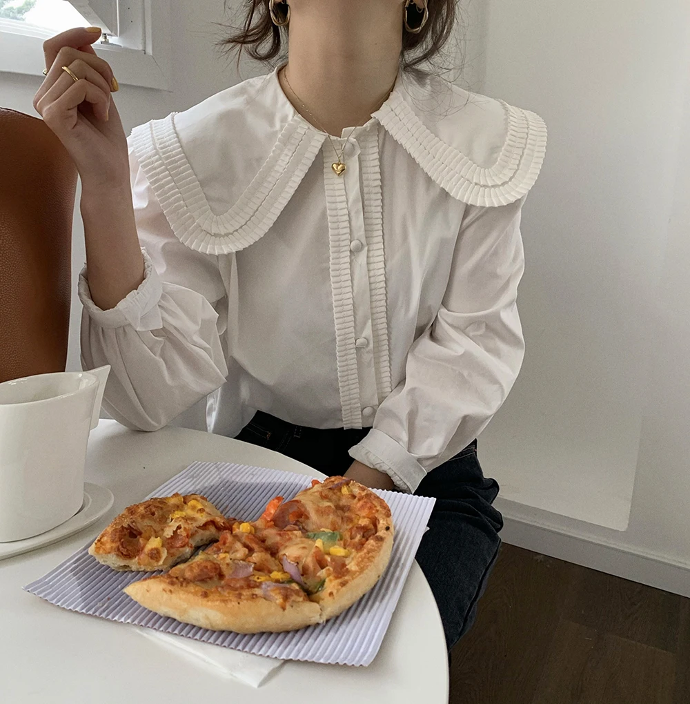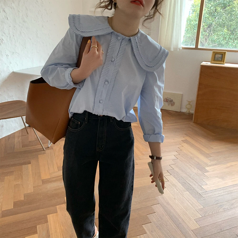 Рубашка Alien Kitty Женская шикарная в стиле ретро, нежная плиссированная Элегантная блузка с воротником Питер Пэн и длинными рукавами, Короткие топы, весна 2021
