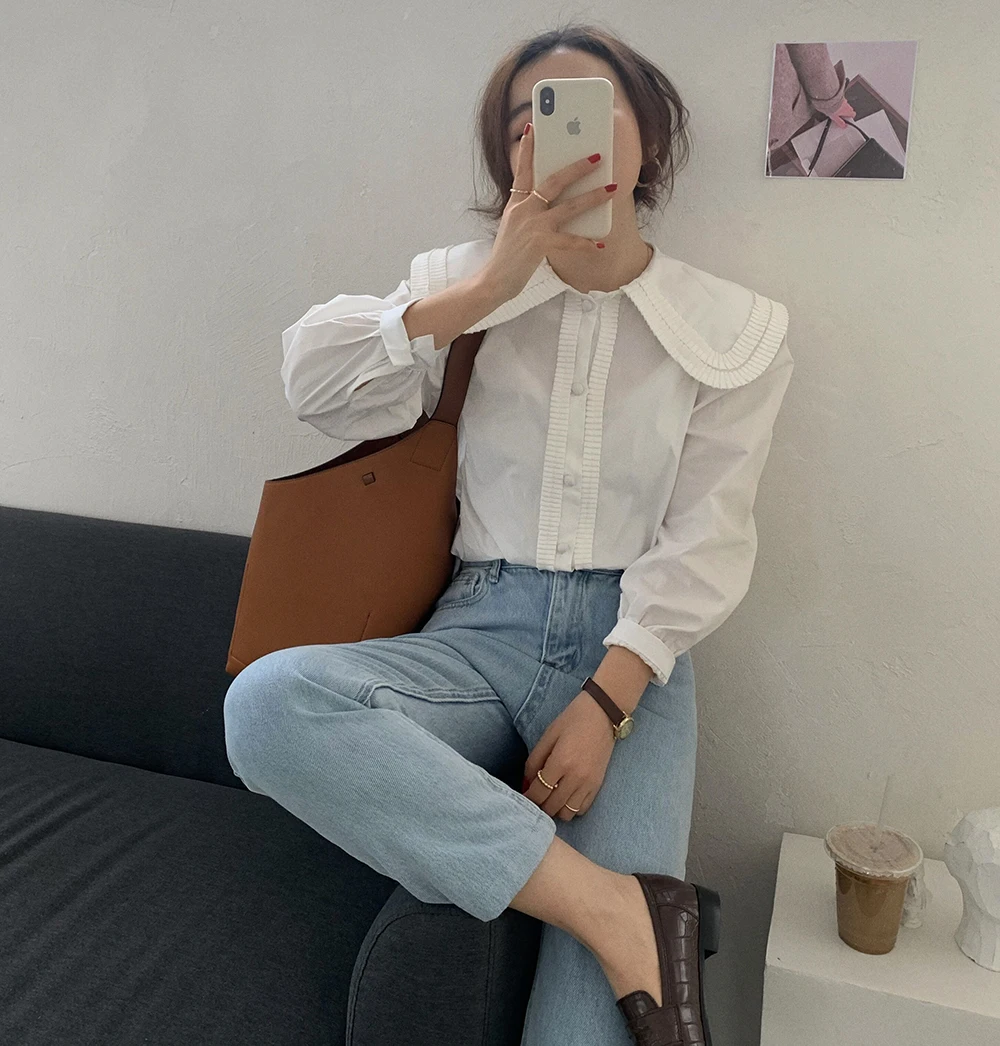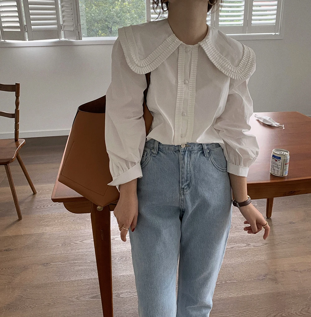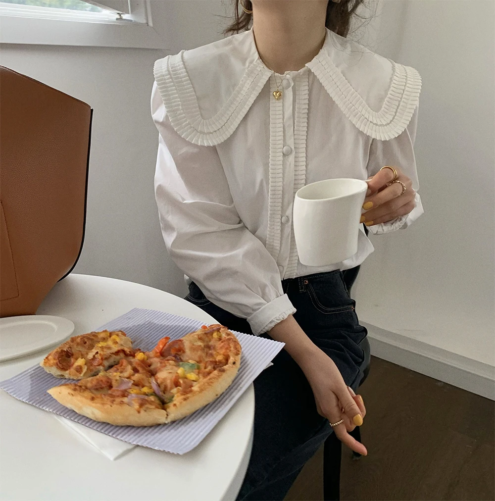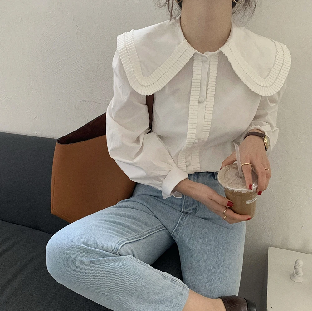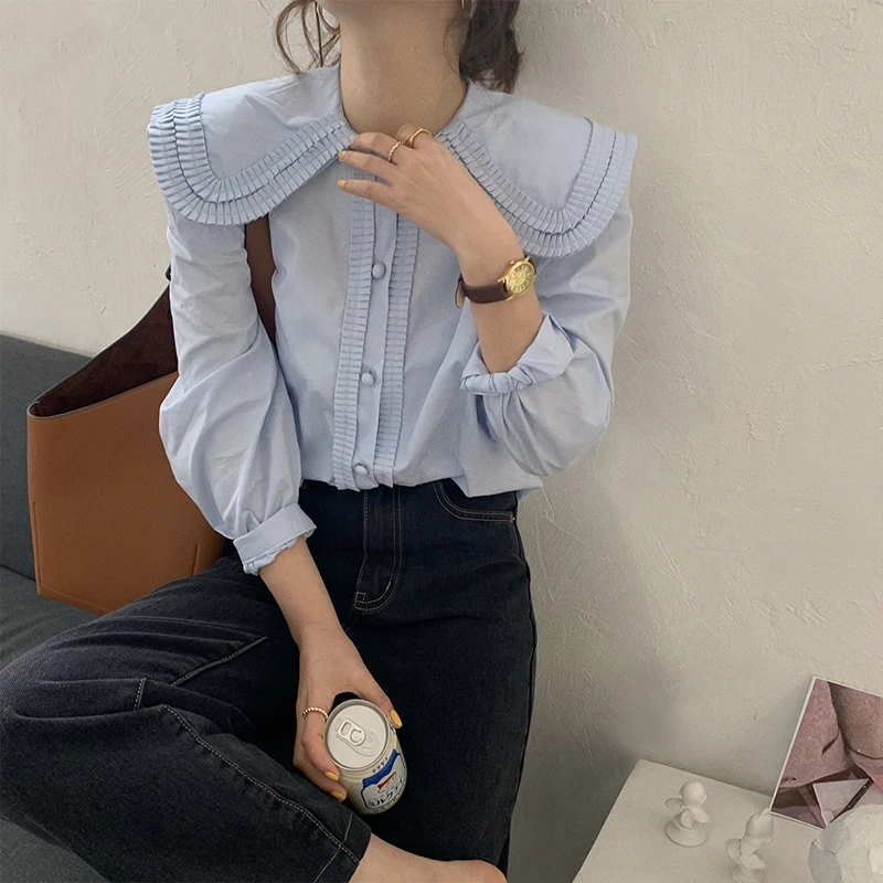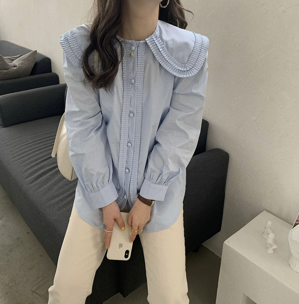 Рубашка Alien Kitty Женская шикарная в стиле ретро, нежная плиссированная Элегантная блузка с воротником Питер Пэн и длинными рукавами, Короткие топы, весна 2021