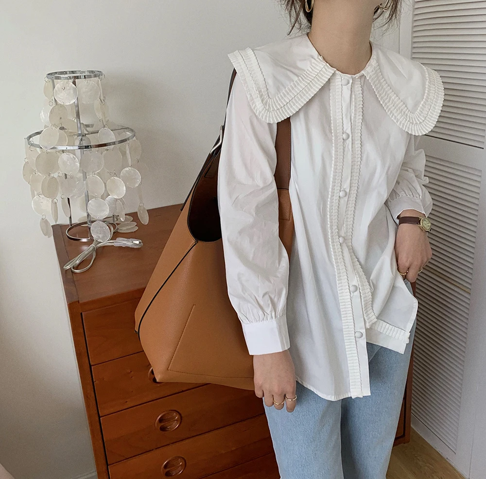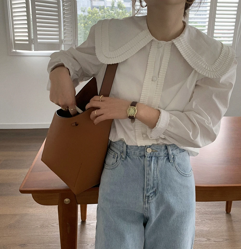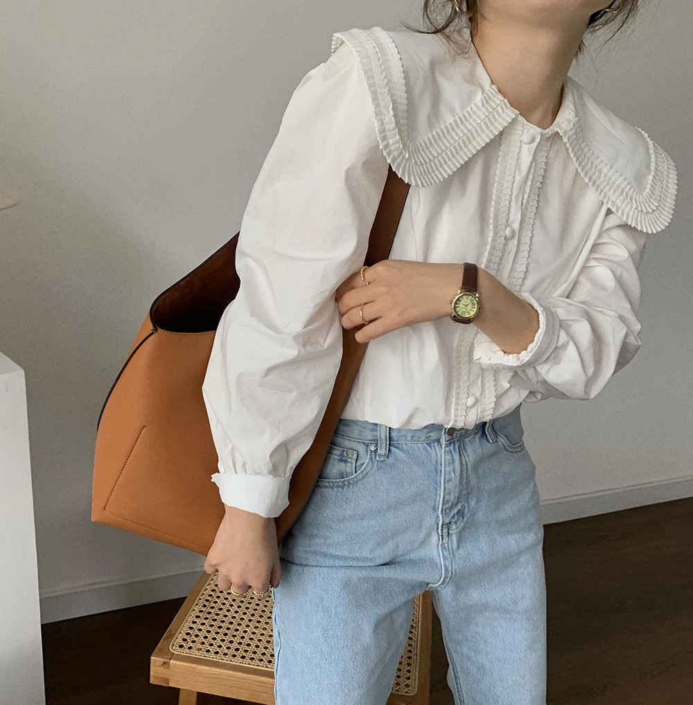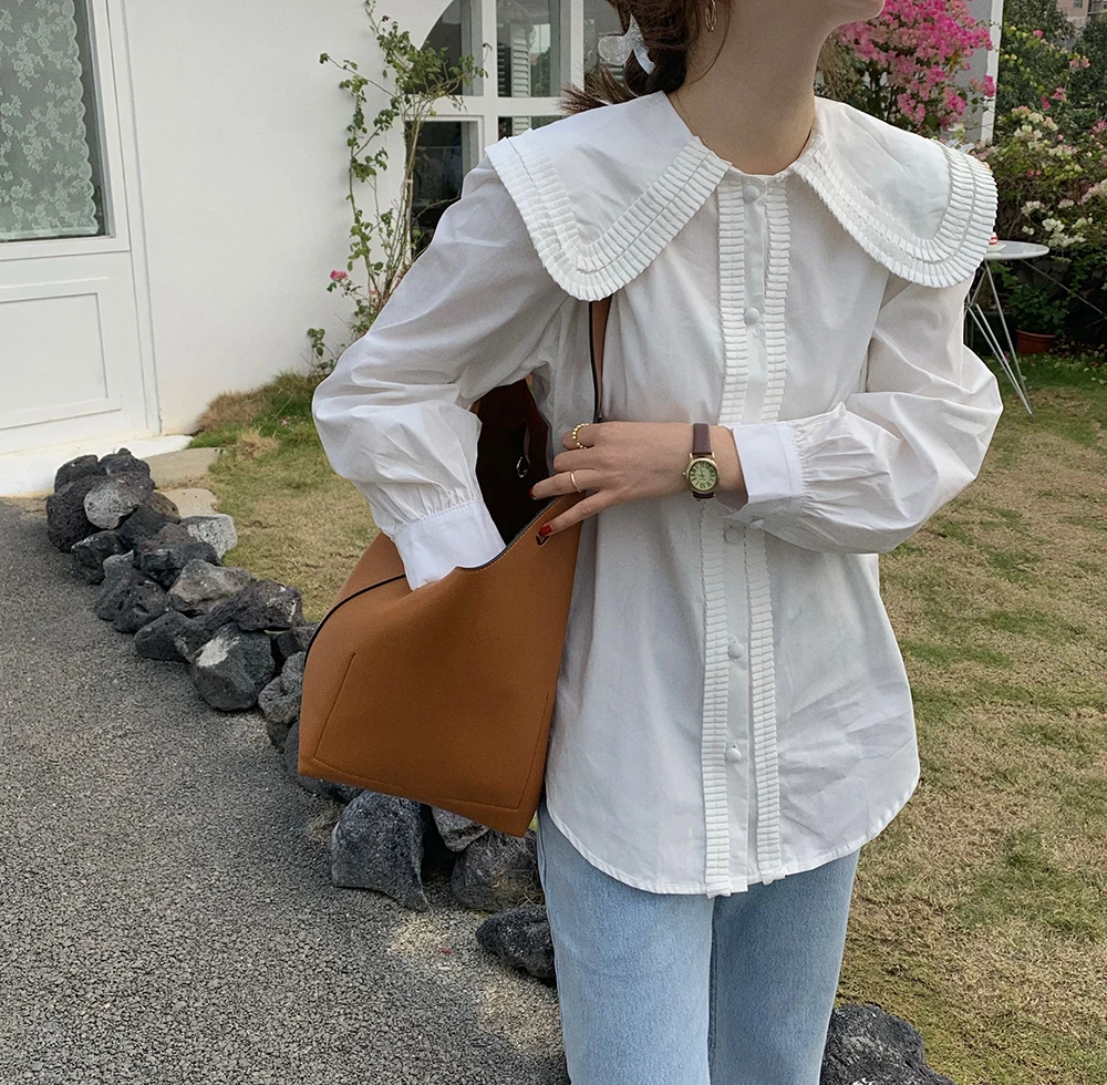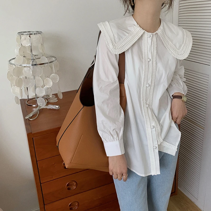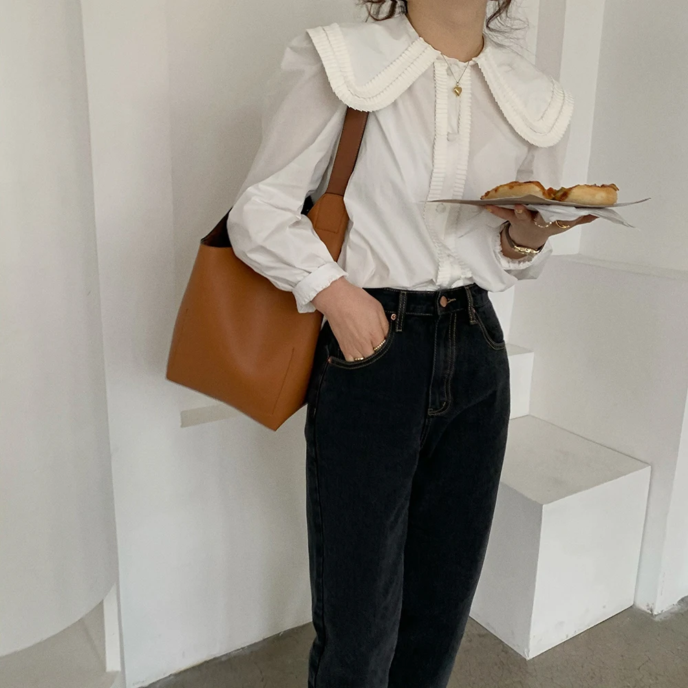 Рубашка Alien Kitty Женская шикарная в стиле ретро, нежная плиссированная Элегантная блузка с воротником Питер Пэн и длинными рукавами, Короткие топы, весна 2021