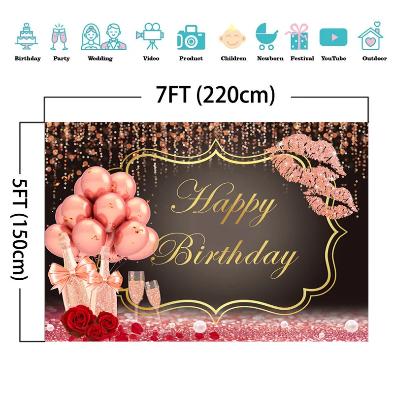Женская фон для дня рождения розовое золото розовый шар в виде красных губ, бокал для шампанского для взрослых с днем рождения баннер фон для фотосъемки с изображением Красной розовые шары
