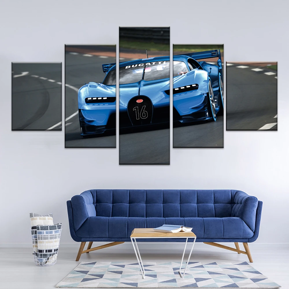5 панельных холщовых картин, роскошный спортивный автомобиль, домашний декор, голубая картина Bugatti, современный Печатный модульный постер для гостиной, настенное искусство
