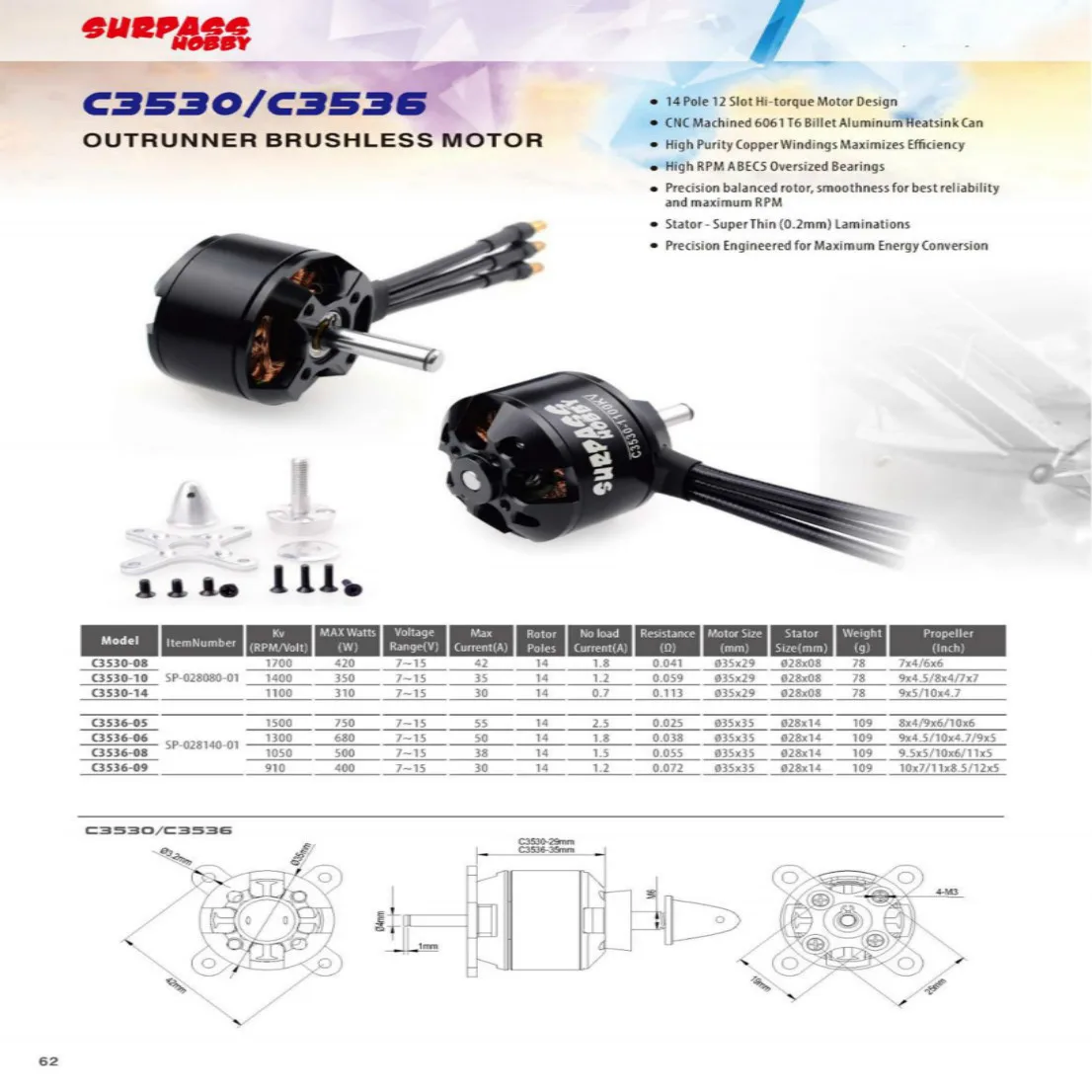 Бесщеточный двигатель SURPASS HOBBY 2814 C3536 910KV 1050KV 1300KV 1500KV 14 полюсов для радиоуправляемых самолетов, неподвижного крыла, планера Warbirds