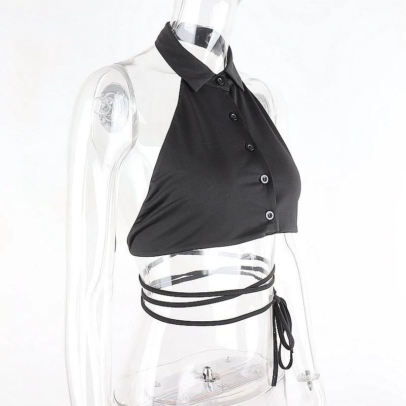 Женский укороченный топ LVINMW, однотонный топ с отложным воротником, V-образным вырезом, без рукавов, со шнуровкой, на пуговицах, с открытой спиной