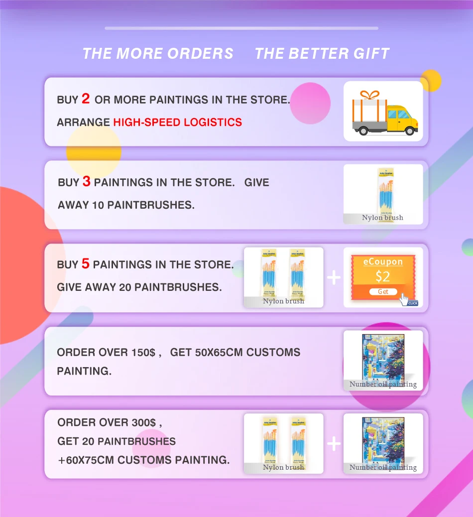 1: купите 2 или более штук в магазине, Организуйте высокоскоростную логистику.2: купите 3 штуки, отдайте 10 ручек.3: купите 5 штук, дайте 20 ручек и 2 $.4: закажите более 150 $, дайте 50*65 см на заказ.