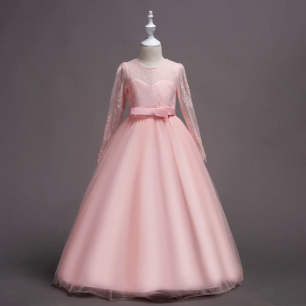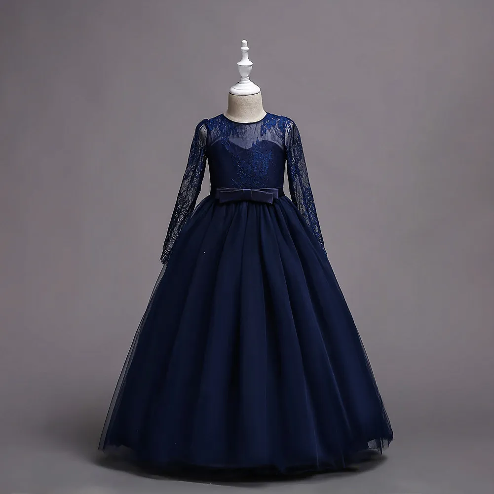 Платье женское кружевное длинное с длинным рукавом и бантом