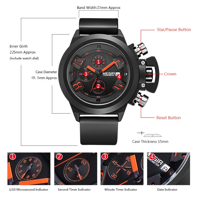 MEGIR Big Dial Fashion Men's Military Sports Watches Waterproof Sil...