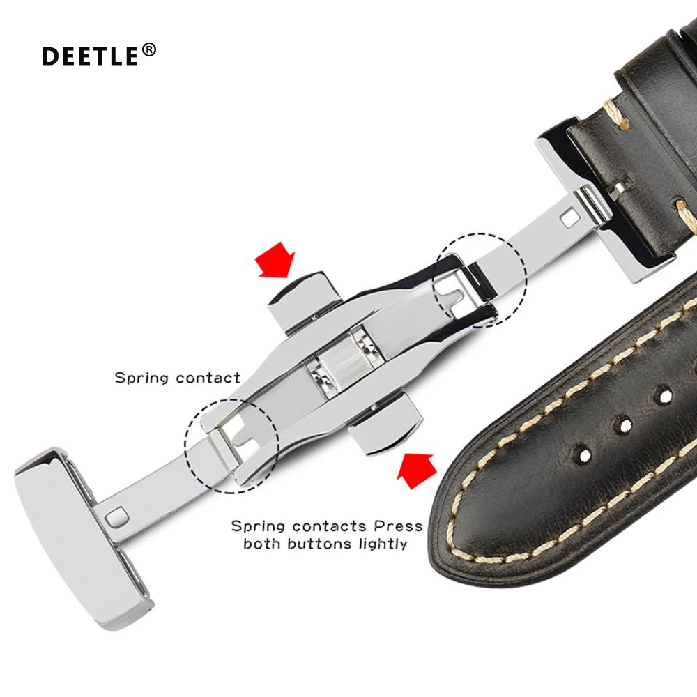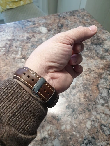 Ремешок качественный, выглядит стильно, соответствует описанию. Застёжка выполнена по принципу бабочка, из нержавеущей стали, по крайней мере так написано на застёжке. Прострочка по контору ремешка ровная качественная. С ремешко дополнительно идут шпильки и инструмент, что очень удобно для качественного монтажа. Изделие высокого качества, смотрится просто шикарно. Продавцу спасибо за быструю доставку и качественный товар.