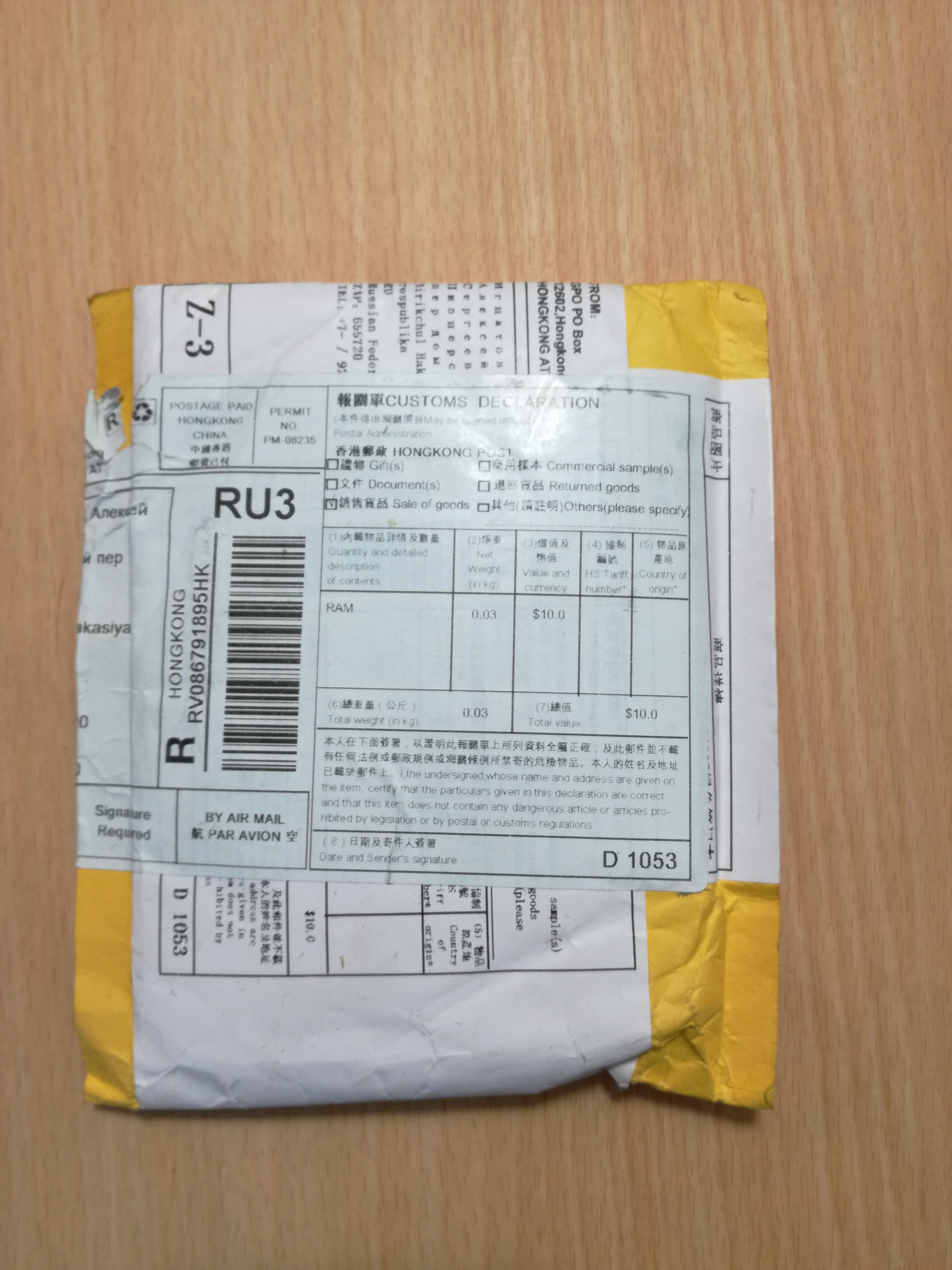 Доставка была осуществлена через менее чем три недели после заказа, в ближайшее отделение почты, как и было обусловлено. Упаковка цела, сам товар упакован в зашитную пленку, благодаря чему переживать за состояние содержимого не следует. Модуль: DDR2 4 GB, 800 MHz для апгрейда старенькой рабочей машинки Asus K50IP, дал возможность работать Windows 10 на ноутбуке 2011 года без проблем. встала в слот, заменив модуль объемом в 1 GB как "там и была", в паре с "родной" для ноутбука планкой на 2 GB работает без нареканий, тесты прошла стабильно, цена оправдана редкостью модуля такого объема для SODIMM типа. Возможно заказал бы еще одну, однако считаю цену слишком уж высокой при отсутствии острой необходимости изначально. Рекомендую для тех, кто имеет старенький, но любимый ноутбук. продавцу - благодарность!