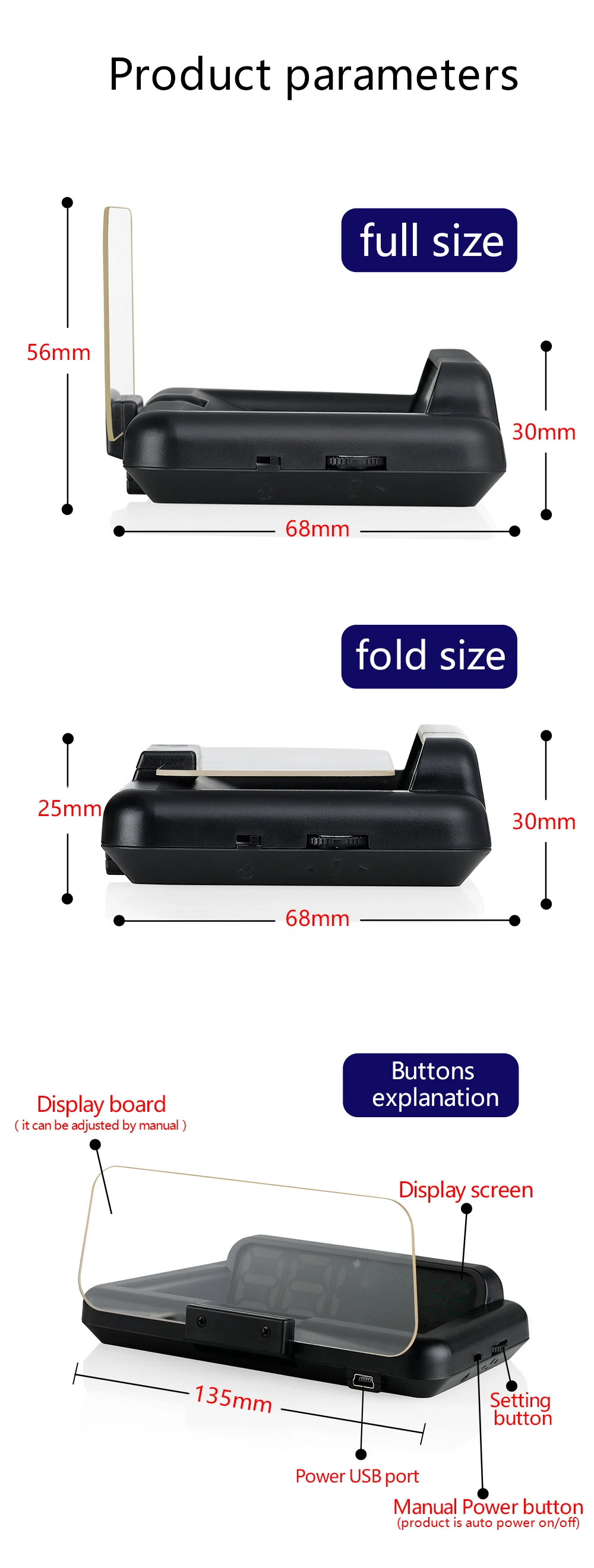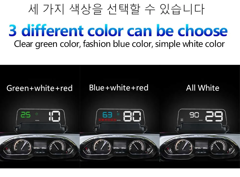 Номер товара: C500 Mirror HUDНазвание продукта: C500 зеркало HUD Дисплей (проектор скорости)Цвет дисплея: белый, синий + белый, зеленый + белыйРазмер блока: 135x68x30 (мм)Материал: пластик + АБС-пластикДисплей: скорость автомобиля, часы, напряжение батареи. Об/мин, температура водыСигнализация: превышение скорости, неисправность двигателя, температура воды, напряжениеСовместимость для: автомобилей в стандарте OBD IIМесто установки: на центральной консолиПодключение: подключение к автомобильному порту OBD