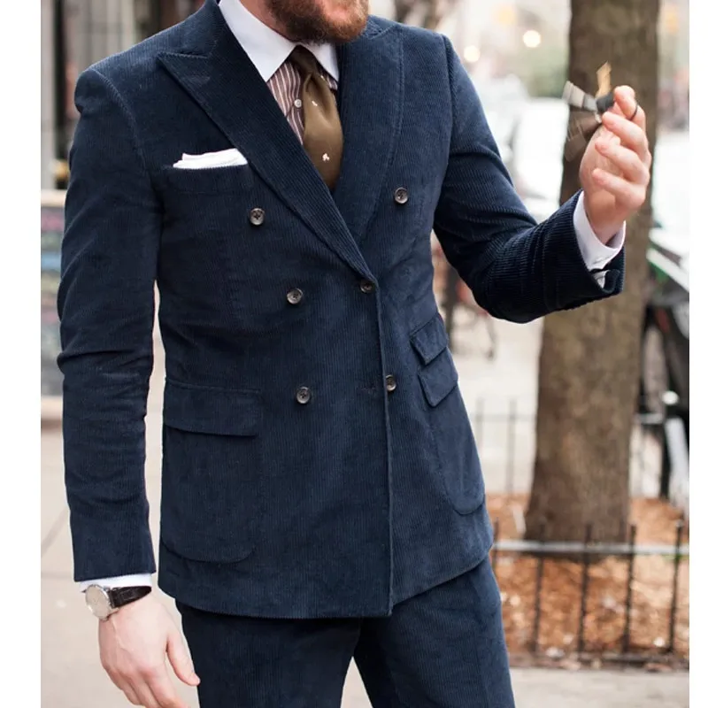 Двубортный повседневный вельветовый костюм для мужчин с остроконечными лацканами из 2 предметов Темно-синий свадебный смокинг жениха джентльмен мужской моды