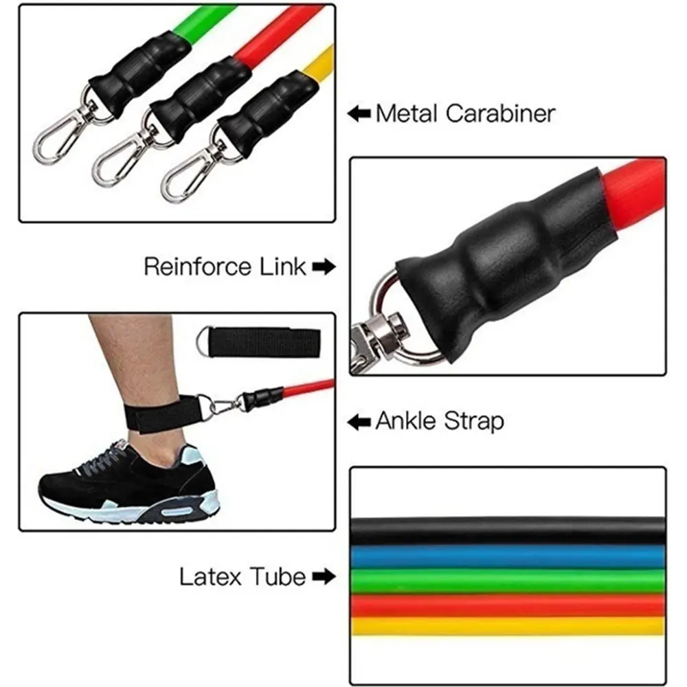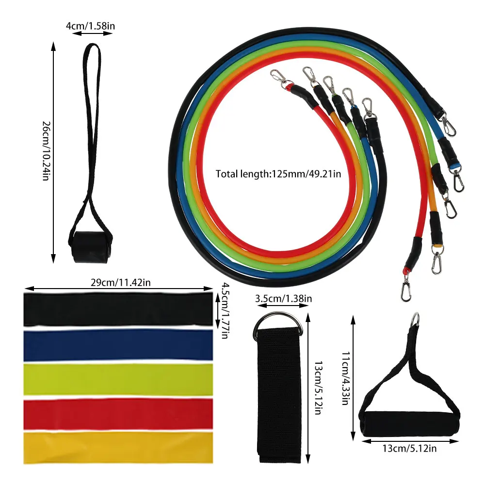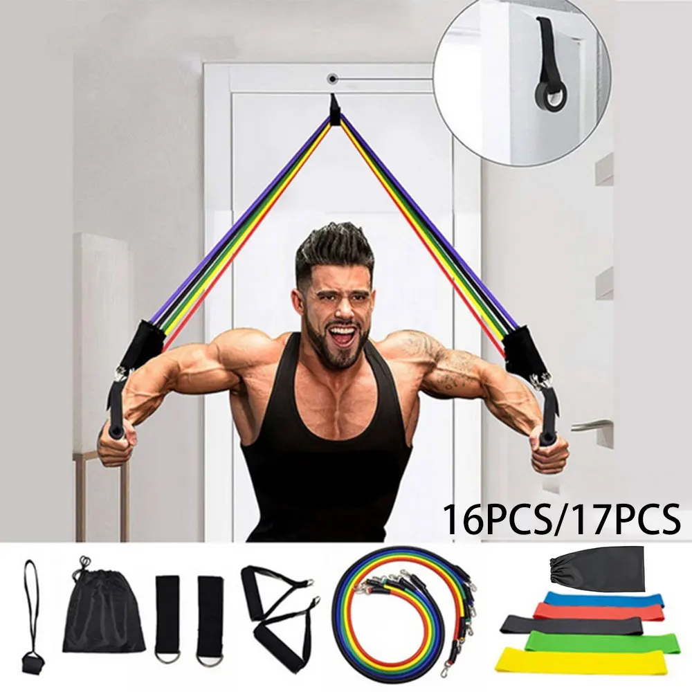 Набор из 16 предметов: 5 натяжных канатов из цинкового сплава TPE 5 колец сопротивления TPE 2 ручки 2 петли для ног 1 дверной зажим 1 сумка для хранения или набор из 17 предметов: 5 натяжных канатов из цинкового сплава TPE 5 латексных колец сопротивления 2 ручки 2 петли для ног 1 дверной захват 2 сумки для хранения (выберите в соответствии с вашими потребностями).