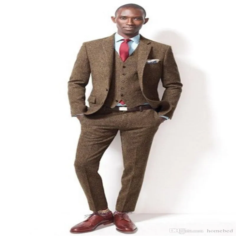 Модные коричневые твидовые смокинги для жениха на двух пуговицах, мужские костюмы, блейзеры (куртка + брюки + жилет)