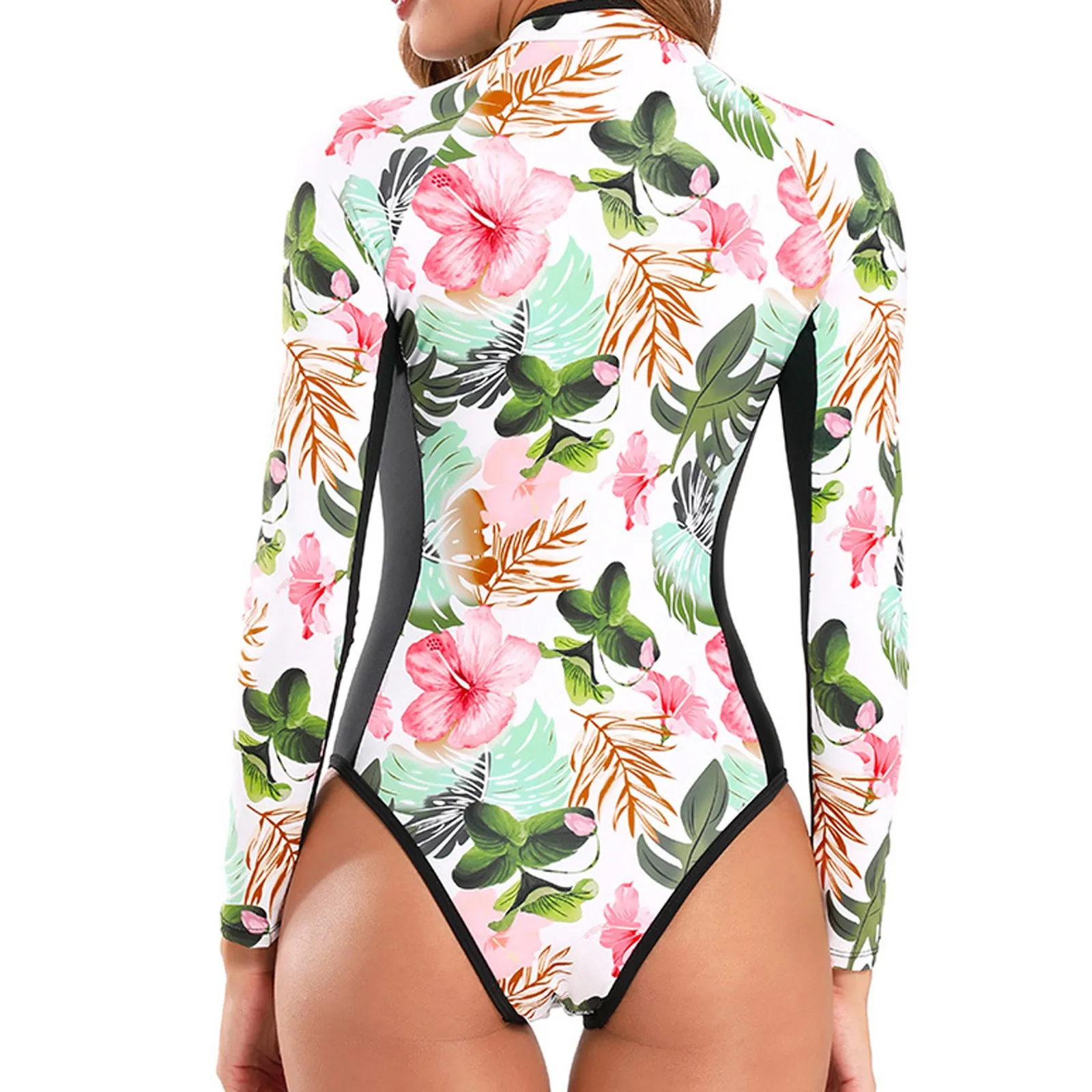 Купальный костюм с цветочным принтом, женская одежда для плавания, монокини с длинным рукавом, женский купальный костюм на молнии, женская одежда для плавания, пляжная одежда
