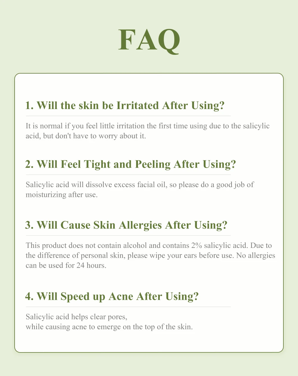 Реальная оценка изменений кожи2% салициловая кислота, акне исчезлиНа рынке большинство продуктов по уходу за кожей содержит только 1% салициловую кислоту. Но для кого-то с несколькими акне, как я, эффект немного. Содержание 2% в точности. Через 2-3 дня большие прыщи на лице исчезли, и отметка также медленно выцветает, что является фантастическим.--- Нини