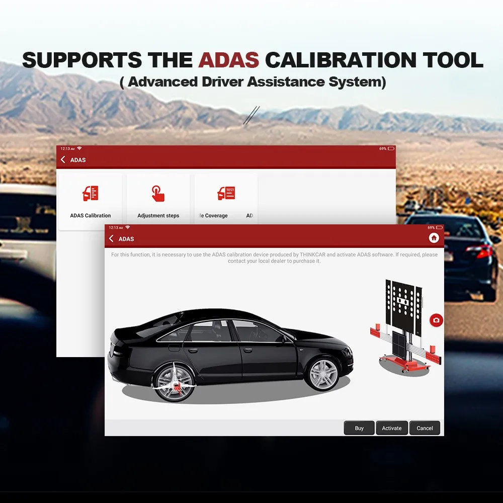 "Продвинутая система помощи водителю (ADAS) является электронным компонентом в транспортном средстве, включая различные функции безопасности транспортного средства, такие как автоматическое аварийное торможение (AEB), предупреждение о выезде полосы движения (LDW), помощь по уходу за полосами, устранение слепых зон, камера ночного видения и Адаптивное освещение. Функция на оборудовании отключена по умолчанию, и пользователю необходимо активировать функцию с помощью карты активации перед использованием. И эта функция должна сочетаться с инструментами калибровки THINKCAR ADAS. В основном используется для калибровки различных камер и радаров систем помощи водителю"