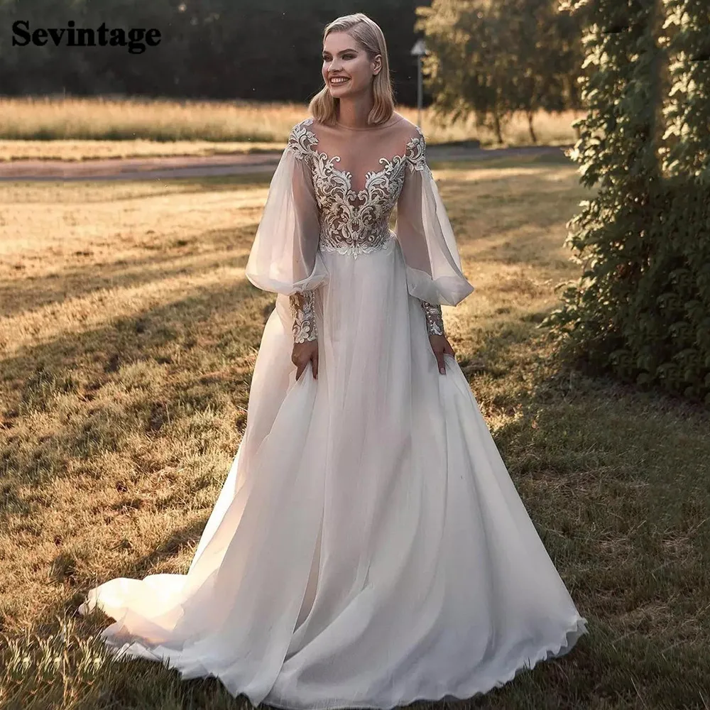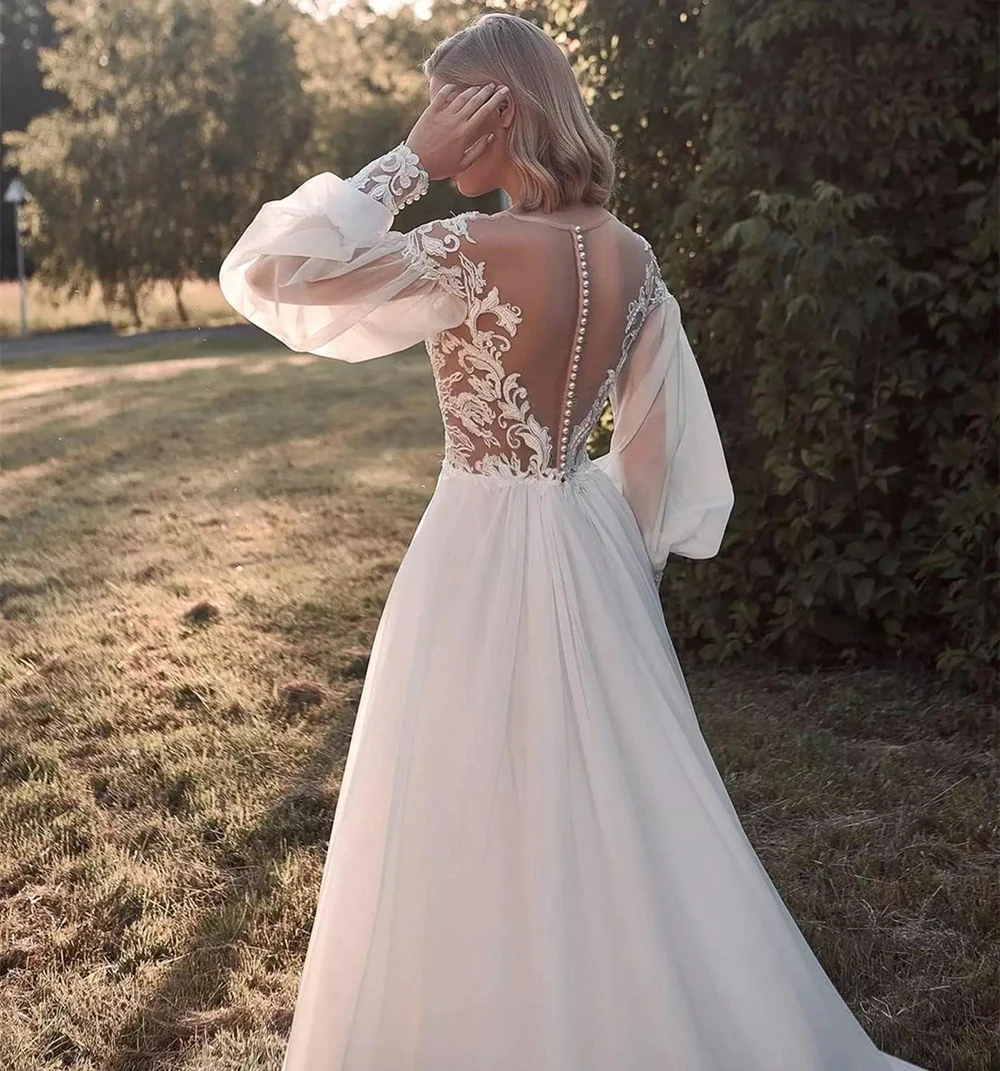 Шифоновое свадебное платье с длинными рукавами-фонариками, кружевное платье невесты с круглым вырезом и аппликацией в стиле бохо, платье принцессы на пуговицах для свадебной вечеринки