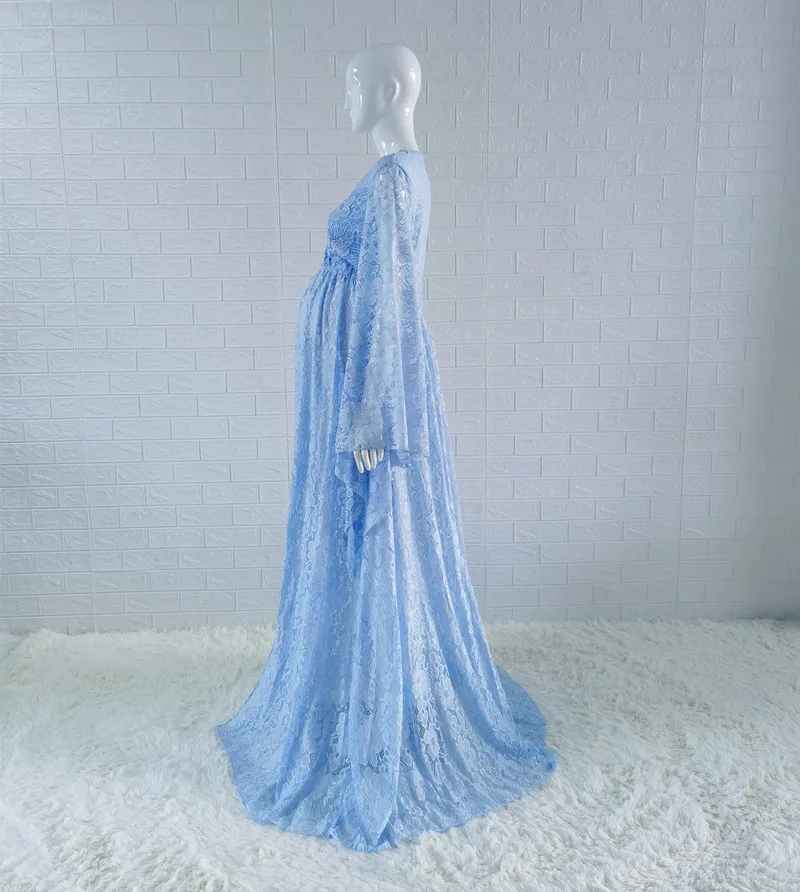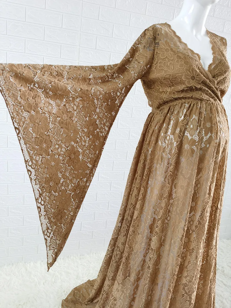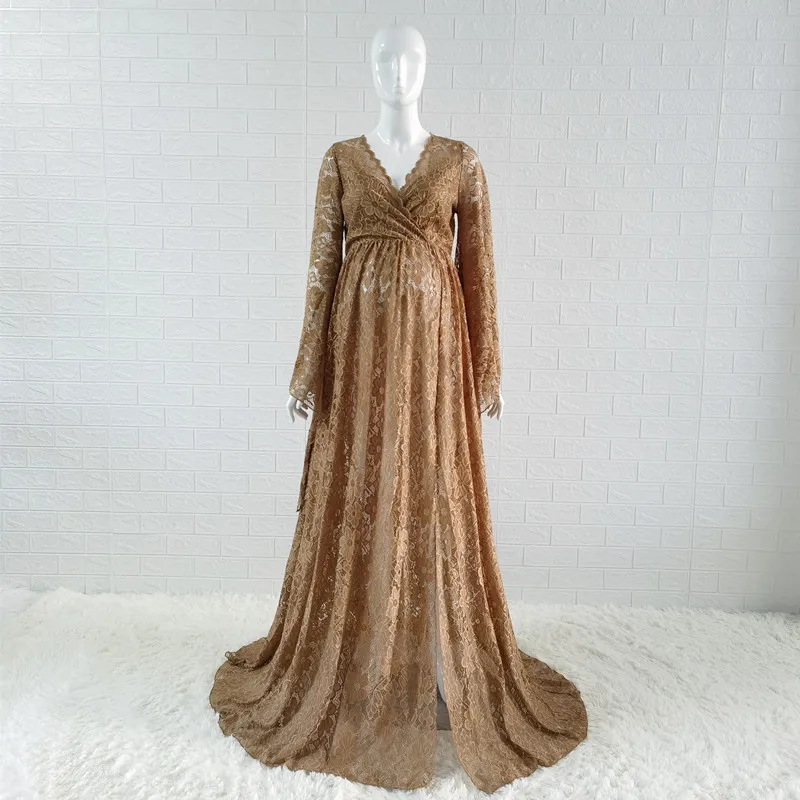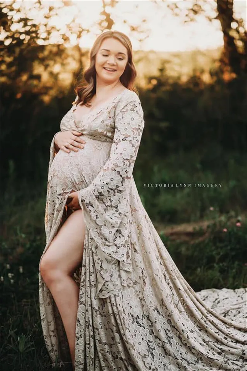 Платье в стиле бохо для беременных с разрезом по бокам кружевное длинное платье для беременных женщин с расклешенным рукавом для фотосъемки