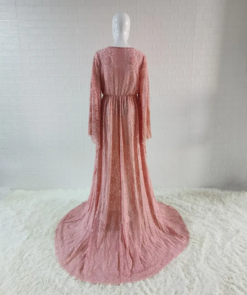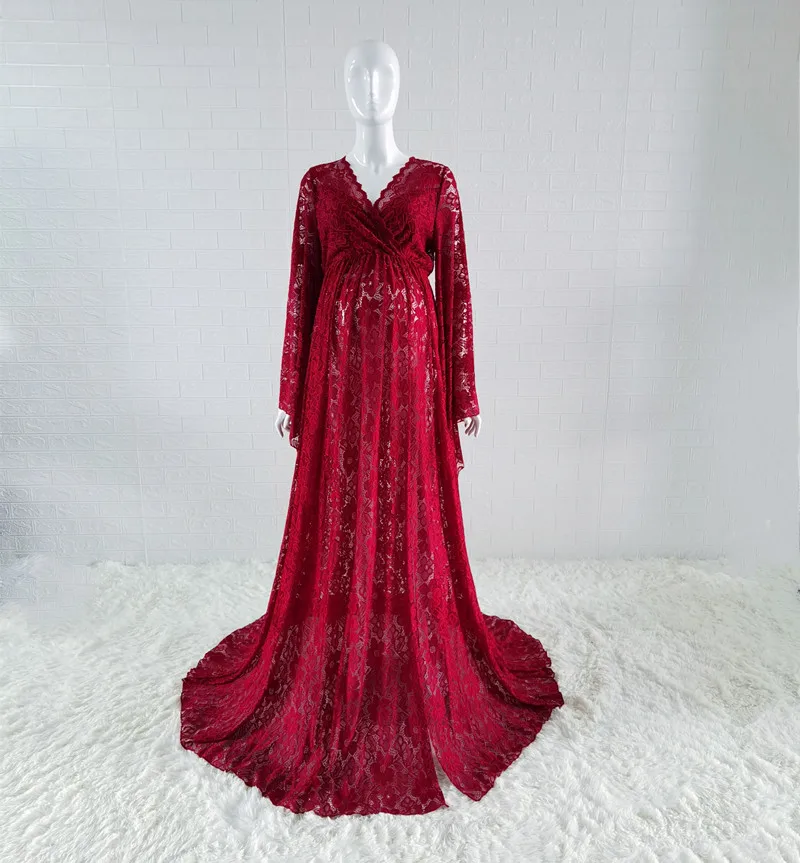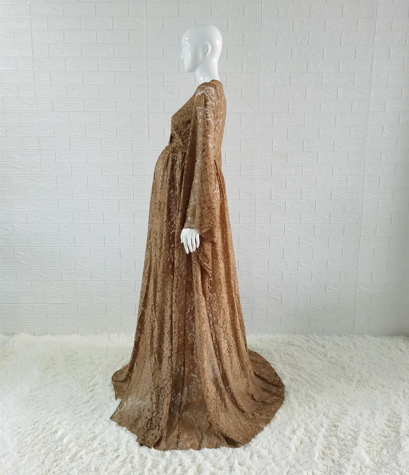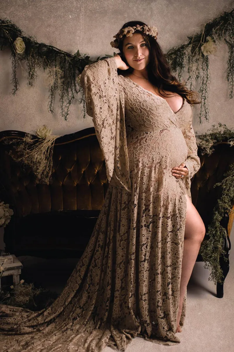 Платье в стиле бохо для беременных с разрезом по бокам кружевное длинное платье для беременных женщин с расклешенным рукавом для фотосъемки