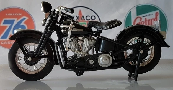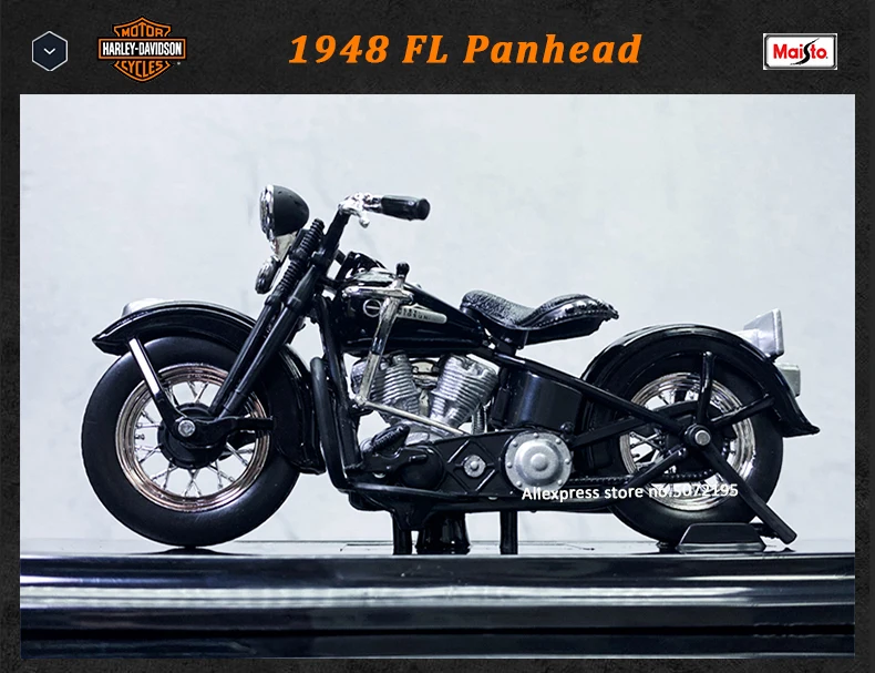 Описание продуктаНаименование: 1948 FL PheadРазмер: около 12 см x 4,5 см x 6,5 смМасштаб: 1:18Материал: часть топливного бака-сплав, а другая-ABS и РезинаУпаковка: полноцветная коробка с окошкомФункция:●Переднее колесо и руль могут поворачиваться из стороны в сторону●Подвижная подставка●Пружинная задняя подвеска● Свободные колеса