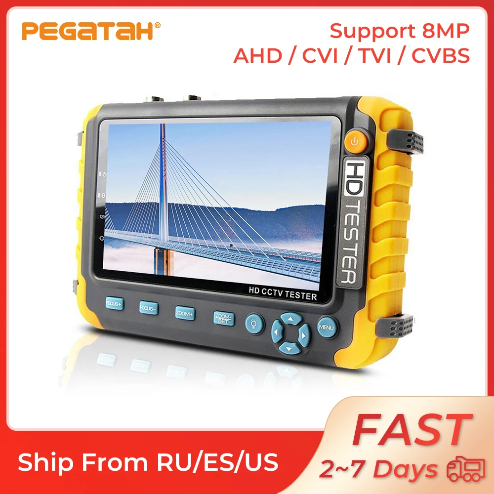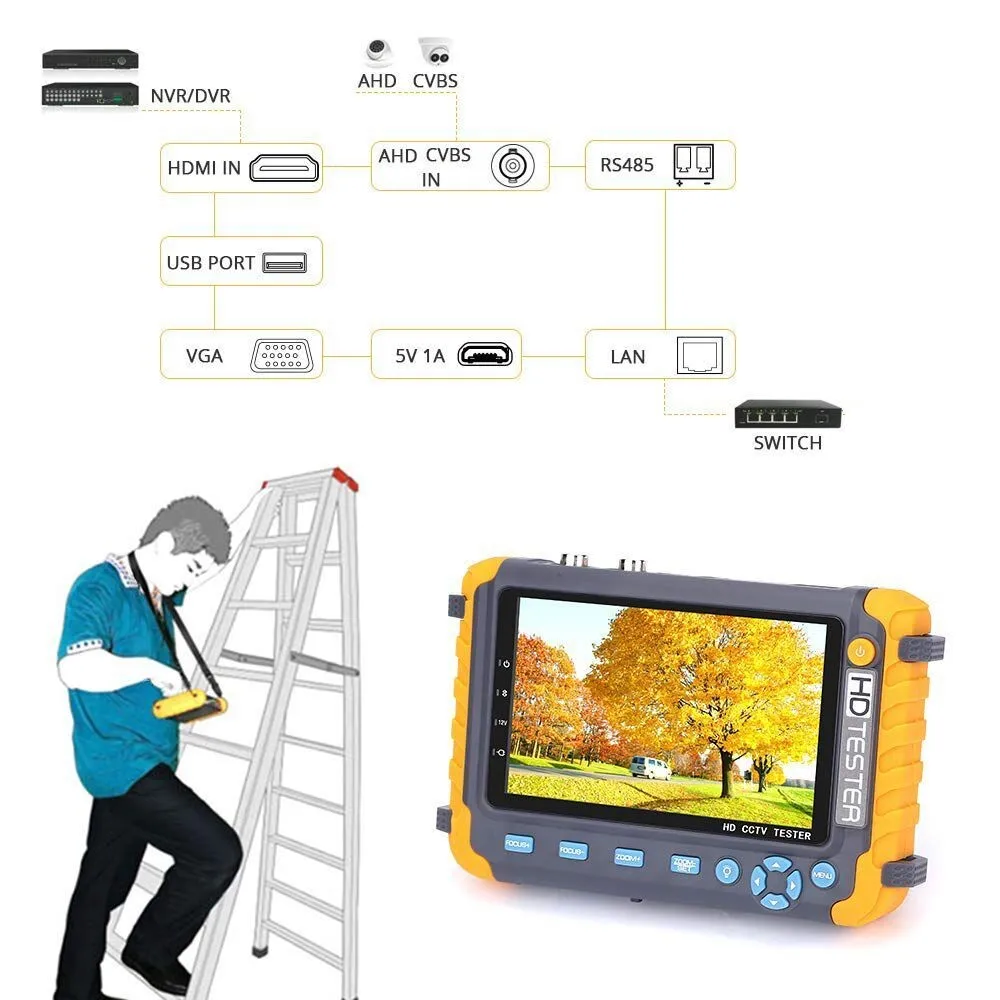 Поддержка CVBS + AHD (8MP) + TVI (8MP) + тест CVI (8MP) камеры + выход HDMI, 4-в-1 CCTV Test er monitor. 5 дюймов 800x480 дисплей с высоким разрешением, более интуитивно понятный и простой для отображения качества изображения камеры, поддержка стандартного видеосигнала PAL/NTSC.