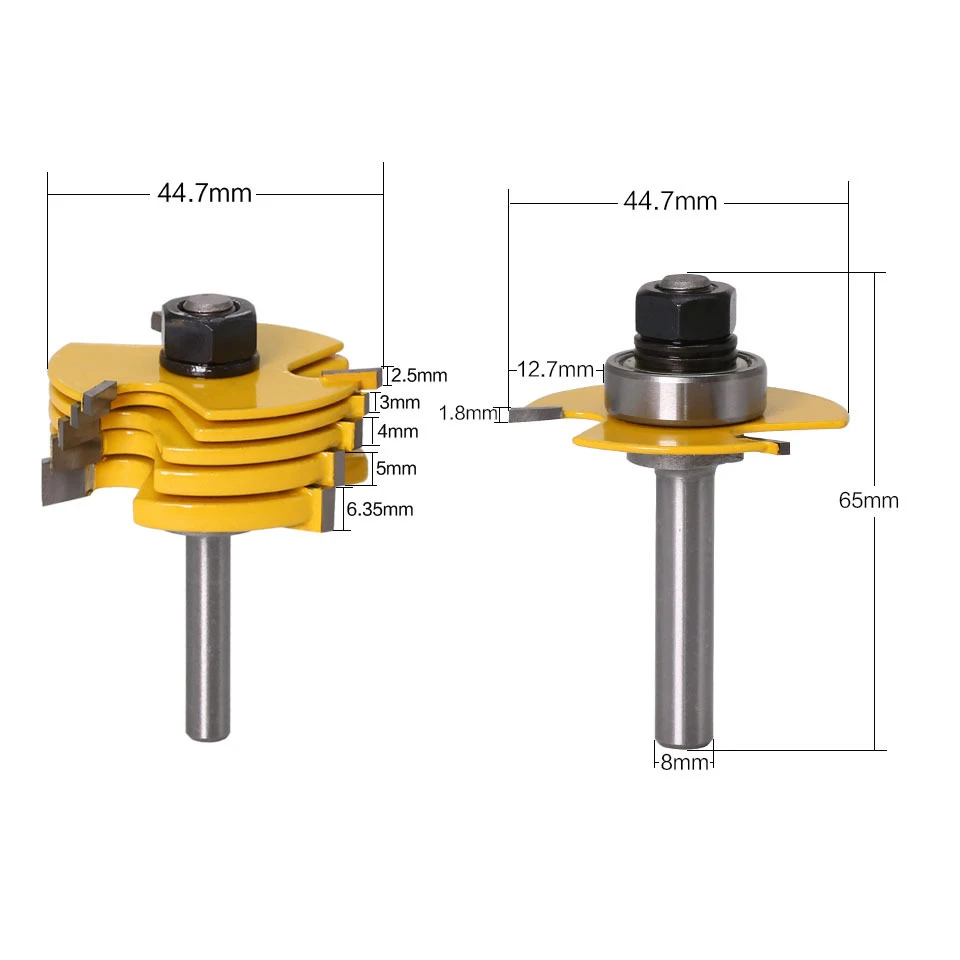 -Тип: Набор насадок-Диаметр хвостовика: 8 мм-Диаметр: 44,7 мм-Длина резки: 1,8 мм, 2,5 мм, 3 мм, 4 мм, 5 мм, 6,35 мм-Общая длина: 65 мм-Материал флейты: твердосплавная сталь YG6-Материал корпуса: 45 # углеродистая сталь-Тип хвостовика: прямой-Для использования на: разрезает все материалы по составу, плит, твёрдый лес, и softwoods