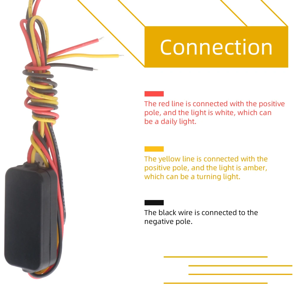Подключение провода: Красный провод подключается к положительным/дневным огням, черный провод подключается к отрицательным-и желтый цвет подключается к сигнальным огням поворота. Простая установка.