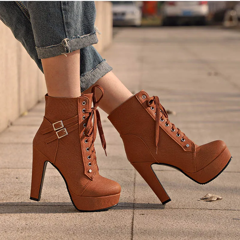 Женские ботильоны на платформе и высоком каблуке, женские ботинки со шнуровкой и пряжкой, женские короткие ботинки, женская обувь
