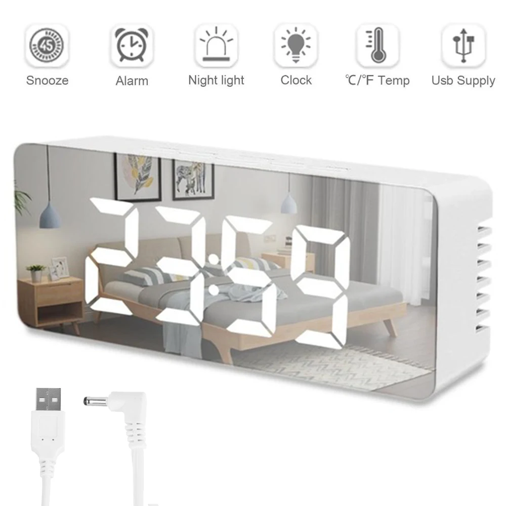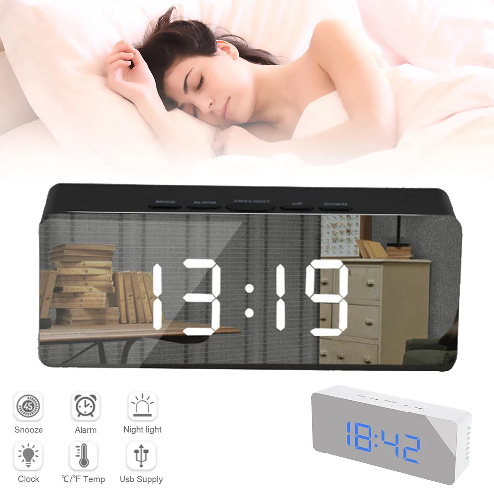 Будильник: 12/24 часовой дисплей, будильник и функция doze. Это так тихо, чтобы обеспечить хороший сон и лучшую рабочую среду, идеальный прикроватный столик, прикроватный или Настольный будильник. Зеркальная поверхность, может использоваться как зеркало для макияжа.