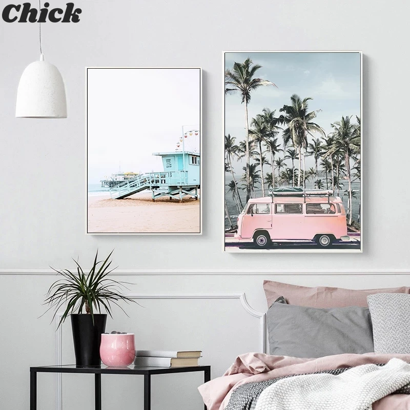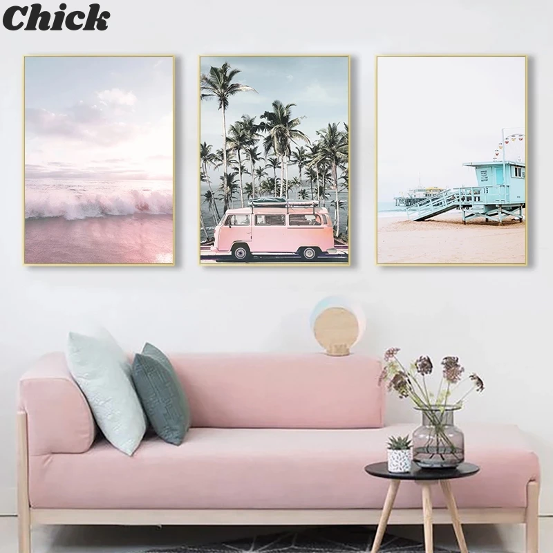 Океанский пейзаж, ярко-розовый автобус, пляж, скандинавский стиль, холст, Художественная печать, живопись, декоративные картины, домашний декор