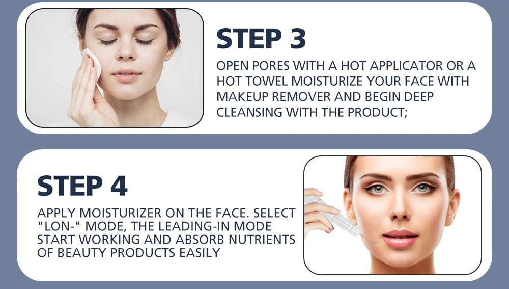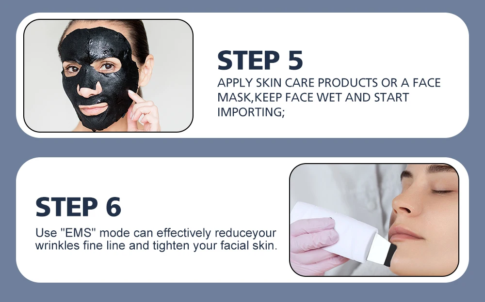Режим 1:Намочите лицо водой;Нанесите очищающее средство для лица и включите режим «SONIC»;Слегка прижмите головку лопаты к порам на лице на 5 мин, затем очистите водой.Режим 2:Откройте поры горячим аппликатором или горячим полотенцем на 5 мин и нанесите питательную эссенцию;Переключитесь в режим «EMS», слегка прижмите лопату к порам на лице на 5 мин, чтобы повысить метаболизм и увлажнение кожи;Очистите водой, используйте испаритель холодного спрея для лица в течение 10 минут, чтобы сузить поры.Режим 3:Чистое лицо водой;Откройте поры горячим аппликатором или горячим полотенцем на 5 мин, нанесите экстракт черных точек на 10 мин; Переключитесь в режим «ION»;Слегка прижмите головку лопаты к порам на лице на 5 мин, затем очистите водой.