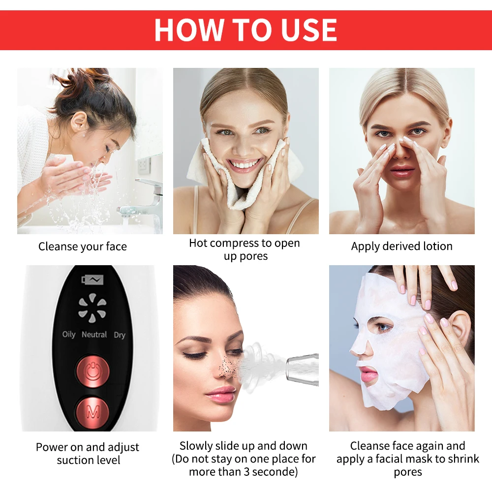 【 Функция 6 в 1 Многофункциональный косметический инструмент, который смешивает Отшелушивающий, укрепляющий, Очищающий поры, акне и удаление черных точек в одном.【Вакуумная система всасывания может мягко поднимать и массировать кожу, способствует циркуляции крови и лимфы, способствует метаболизму, таким образом, чтобы обеспечить обильное питание кожных тканей, затянуть и осветить кожу.【 3 modes】 режим масла с небольшим всасыванием для масляной кожи; Нормальный режим с сильным всасыванием для нормальной кожи; И сухой режим со средним всасыванием для сухой кожи. 【 6 сменных наконечников 】 6 различных наконечников для различных проблем с кожей и кожи. Изменить и использовать по желанию. 【Удобный для пользователей дизайн 】удобный размер как для домашнего использования, так и для использования. Usb-зарядка обеспечивает беспроводное и безопасное использование. Большой экран для более читаемого использования.【Идеальный подарок 】прекрасный подарок для всех, кто хотел бы быть ярче, ваш возлюбленный, друзья, дочь, семьи и многое другое, кто с любовью к красоте. Ваше портативное устройство для ухода за кожей своими руками!