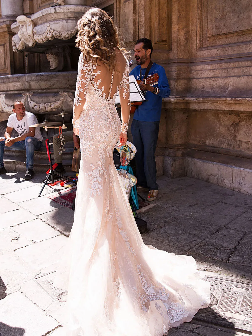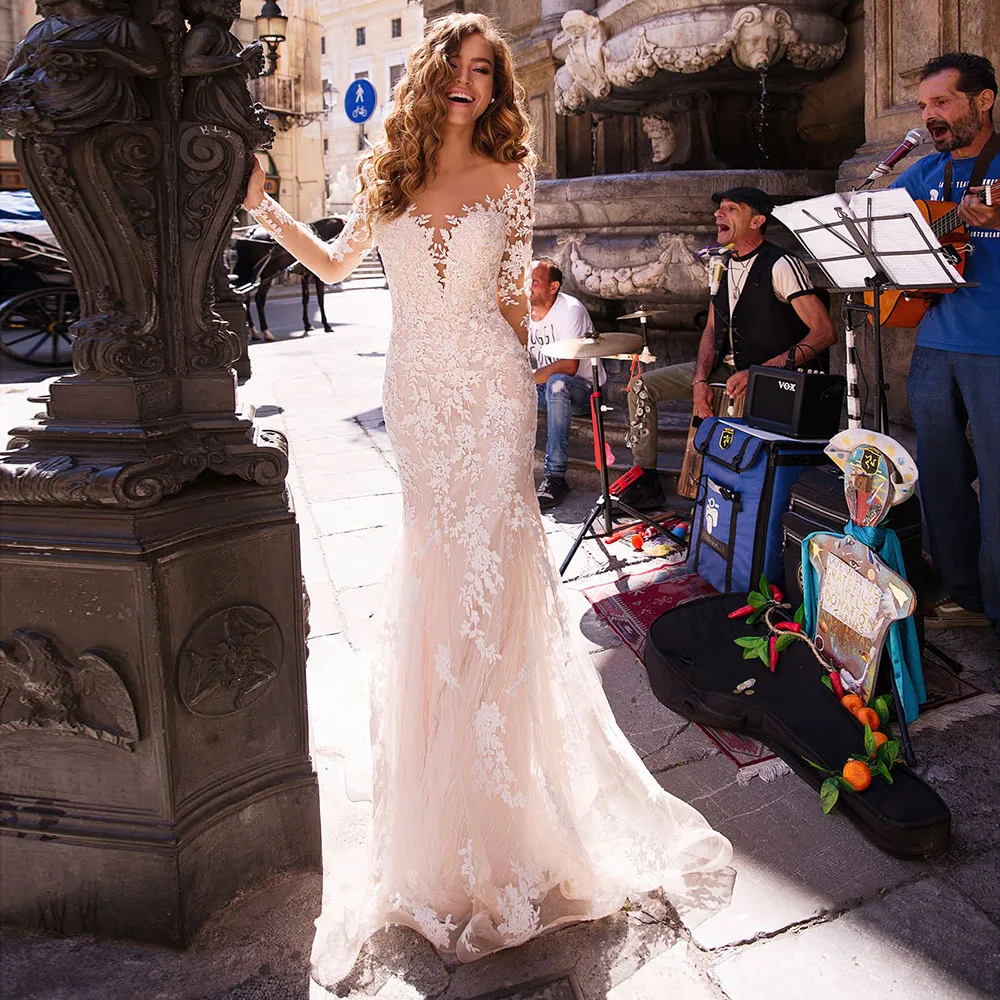 Женское свадебное платье с юбкой-годе, белое платье с длинным рукавом, круглым вырезом, аппликацией из стразов и бисером, длиной до пола, 2021