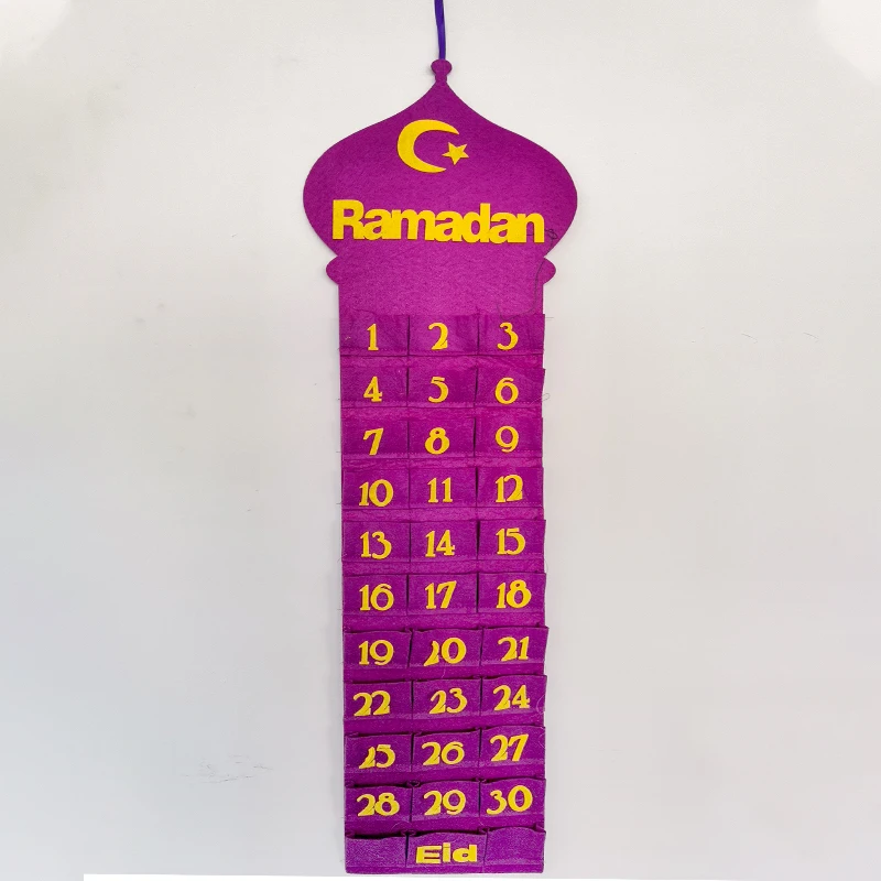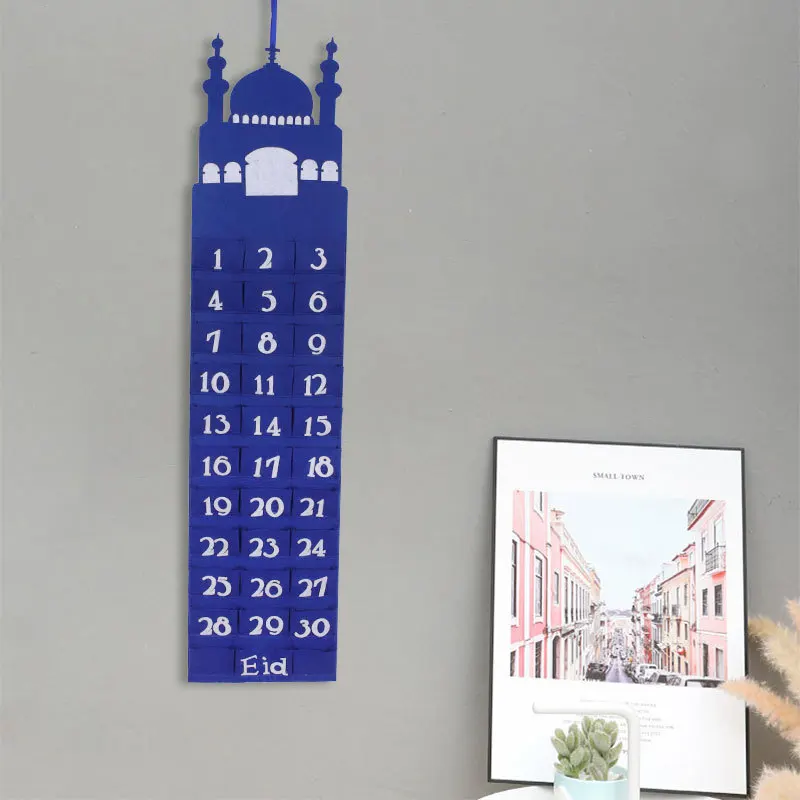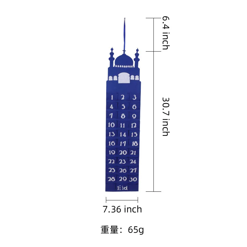 Характеристика:1. Изготовлен из войлочного материала, который удобен и не легко окрашивается, легко моется.2. Луна, Исламская церковь или другие узоры являются лучшими элементами для украшения на Рамадан.3. В календаре есть 30 подвесных сумок, которые можно хранить в цифровых датах или других небольших аксессуарах.4. Помощь в обучении детей рамадану с висящими календарями обратного отсчета и практическими способностями вашего ребенка.5. Подходит для исламских ИД Мубарак или других мусульманских фестивалей в качестве украшения.